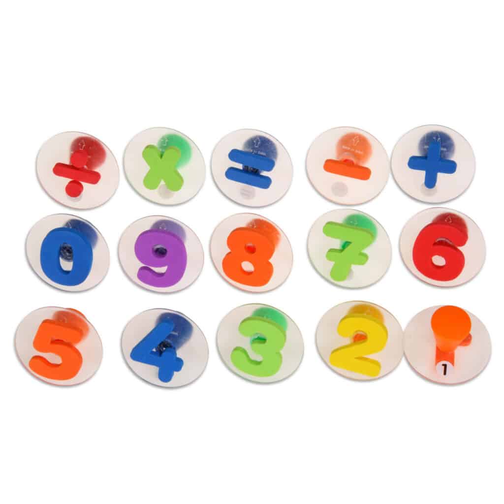 Die Riesen-Zahlen-Stempel beinhalten die Zahlen von 0 bis 9 sowie fünf wichtige Rechenzeichen: Plus, Minus, Mal, Geteilt und Gleich. Jeder Stempel verfügt über einen praktischen Stempelgriff, der nicht nur das Handling erleichtert, sondern auch speziell für kleine Kinderhände konzipiert ist. Die Stempelfläche ist weitgehend transparent, sodass die Kinder genau sehen können, wo sie stempeln, und sicherstellen können, dass sie die richtige Zahl oder das richtige Zeichen verwenden.