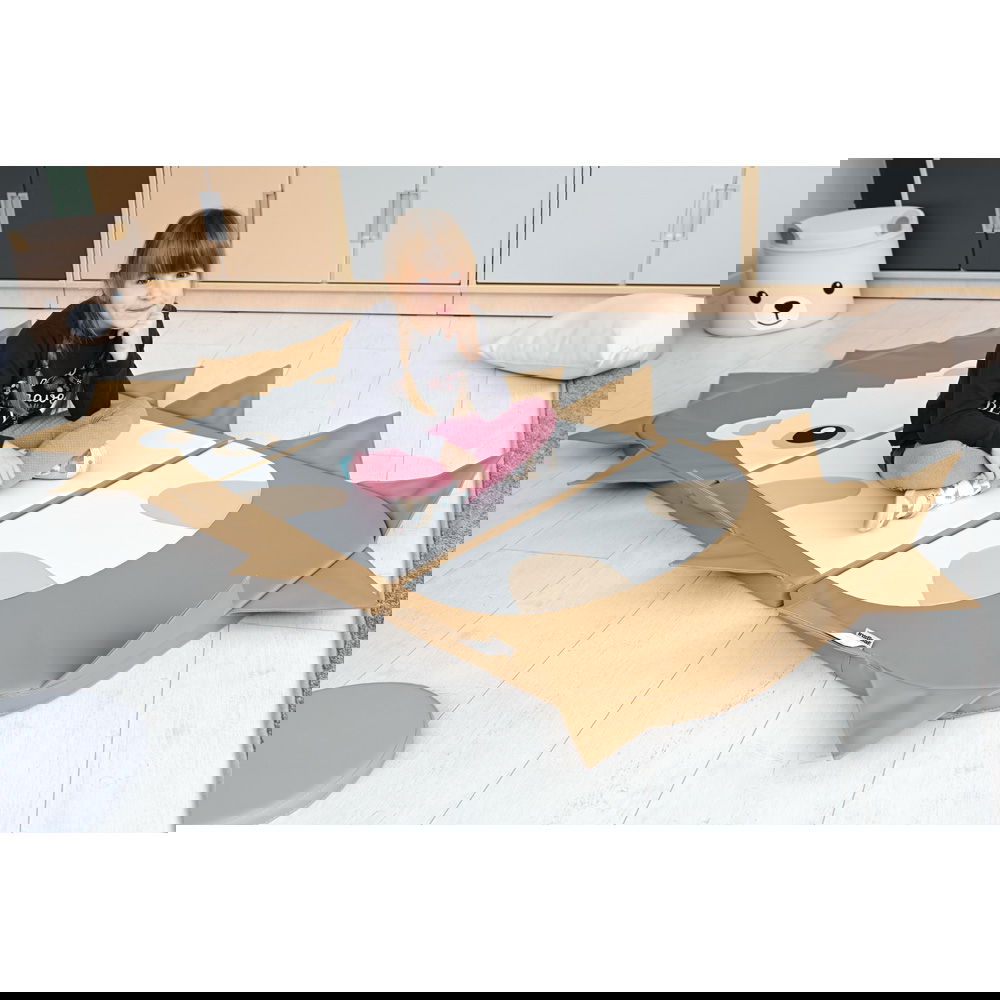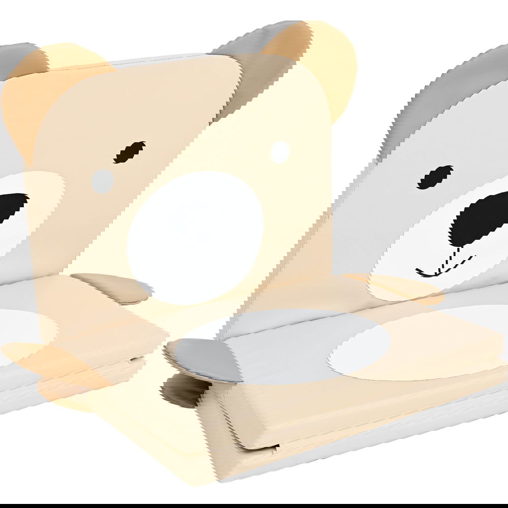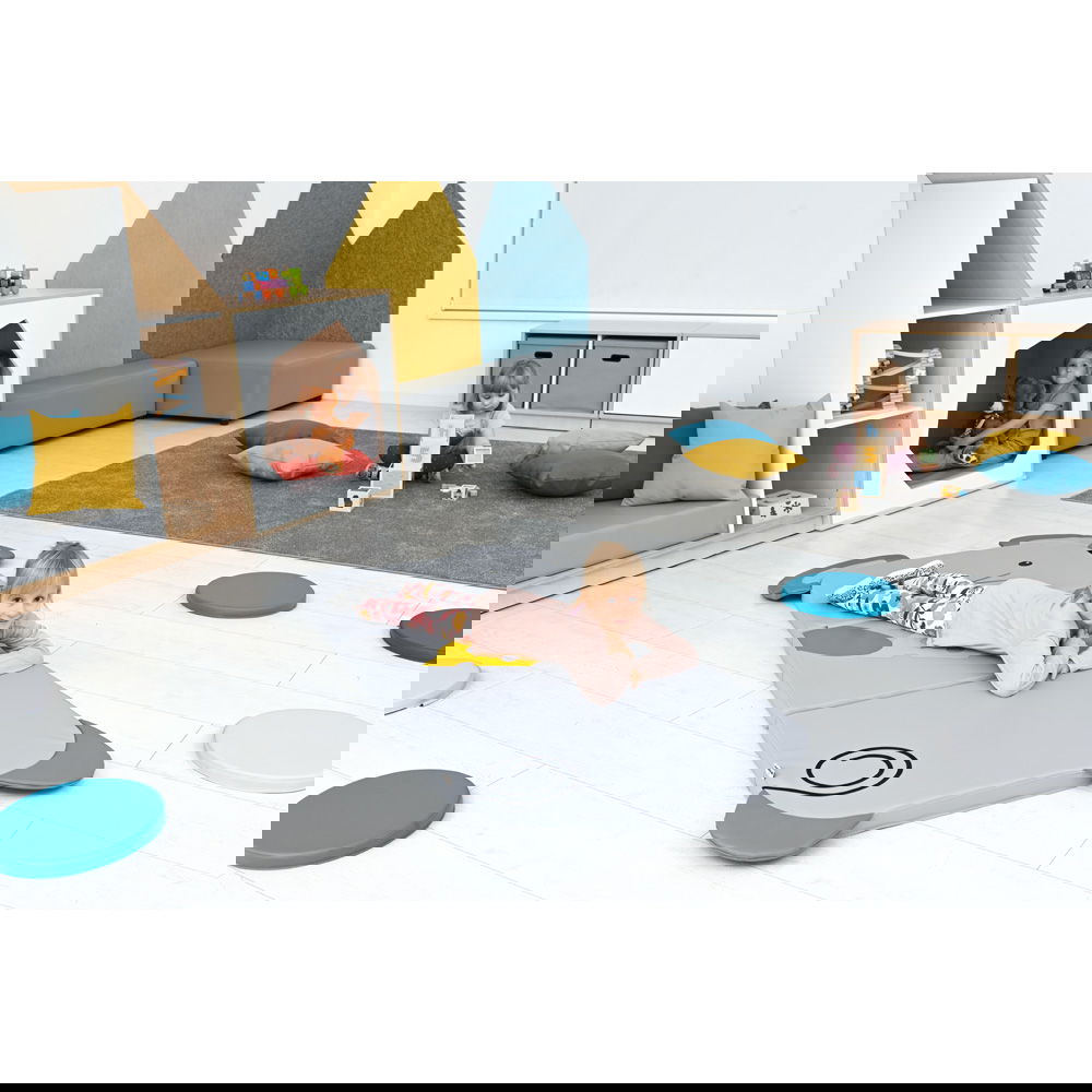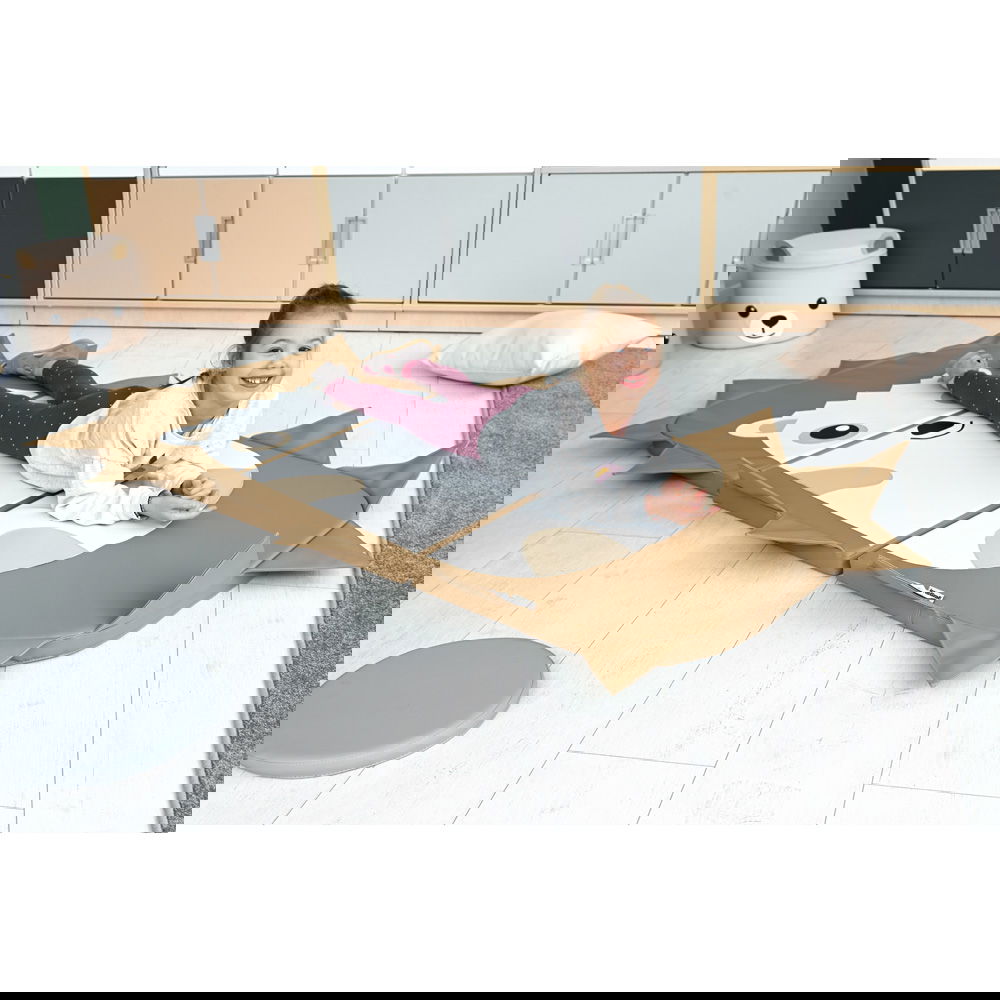Das Besondere an dieser Matte ist ihre clevere, dreiteilige Konstruktion. Im ausgebreiteten Zustand bietet sie eine großzügige, weiche Fläche, die sich hervorragend für erste Turnübungen, ausgiebiges Krabbeln oder entspannte Ruhephasen eignet. Mit einer angenehmen Dicke von fünf Zentimetern schützt sie zuverlässig vor Bodenkälte und federt Bewegungen sanft ab. Wenn es Zeit für eine Pause ist, lässt sich die Matte mit wenigen Handgriffen zusammenklappen. So entsteht im Nu eine bequeme Sitzmöglichkeit mit einer stützenden Rückenlehne – der perfekte Ort, um ein Buch anzuschauen oder einer spannenden Geschichte zu lauschen.