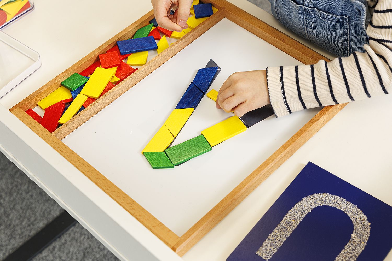 Die Vorlagekarten bieten nicht nur eine Schritt-für-Schritt-Anleitung, sondern machen das Lernen zu einem interaktiven Erlebnis. Kinder können ihre Fähigkeiten in Feinmotorik und Konzentration stärken und gleichzeitig spielerisch ihre Buchstabenkenntnis fördern. Das Legen der Buchstaben mit 400 Legetäfelchen, die in 4 Farben und 10 verschiedenen Formen sortiert sind, regt die Phantasie der Kinder an und schafft ein kreatives Lernumfeld.