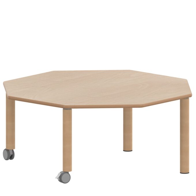 Der Achtecktisch ZALOTTI mit Schichtstoff-Belag und fahrbaren Massivholzbeinen setzt neue Maßstäbe für moderne Arbeits- und Lernumgebungen durch die geniale Kombination aus harmonischer Achteck-Geometrie und cleverer Mobilität. Diese außergewöhnliche zargenlose Tischkonstruktion mit unzerstörbarem 0,8 mm HPL-Schichtstoffbelag und robusten Buche-Massivholzbeinen schafft völlig neue Dimensionen für flexible Gruppenarbeit und spontane Raumgestaltung. Die besondere Achteckform mit acht gleichlangen 50 cm Kanten und zwei integrierten Rollen ermöglicht müheloses Verschieben für spontane Raumrekonfiguration bei gleichzeitig demokratischen Sitzordnungen für bis zu acht Personen. Die zargenlose Bauweise bietet ungehinderte Beinfreiheit für alle Nutzer – auch für Rollstuhlfahrer. Mit acht verfügbaren Höhen von 25 bis 76 cm wächst dieser „Made in Germany“ Qualitätstisch flexibel mit den Anforderungen mit und schafft durch seine natürliche Holzoptik eine warme, einladende mobile Arbeitsatmosphäre.