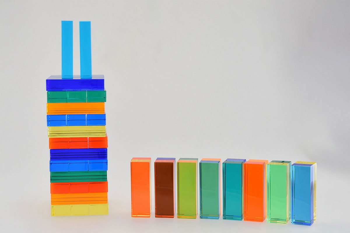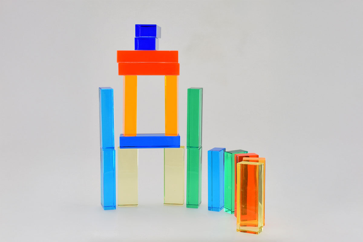 - Material-Mix: Die Steine lassen sich hervorragend mit klassischen Holzbausteinen oder anderen Baumaterialien kombinieren. Der Kontrast zwischen dem natürlichen, warmen Holz und dem glatten, kühlen Acryl bietet haptische Abwechslung und neue bauliche Herausforderungen.