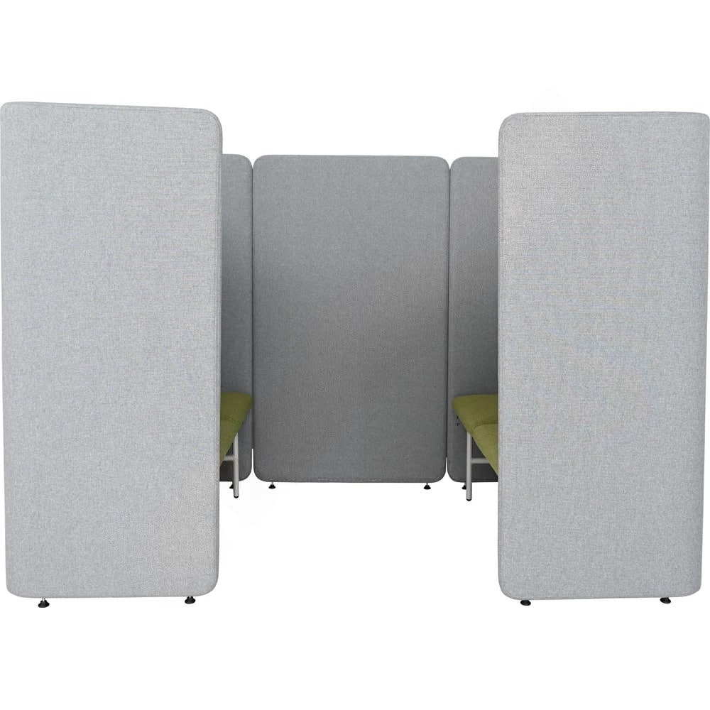 Hergestellt mit einem gepólsterten Holzrahmen und einem stilvollen Textilbezug in Grau, sorgt die Meetingbox für eine angenehme Atmosphäre. Die 4 Sitze sind mit hochwertigem Schaumstoff (RG 40 kg/m³) gepolstert und bieten ein komfortables Sitzerlebnis, während der Bezug aus 100% PE in Dunkeloliv eine einladende Farbnote setzt.