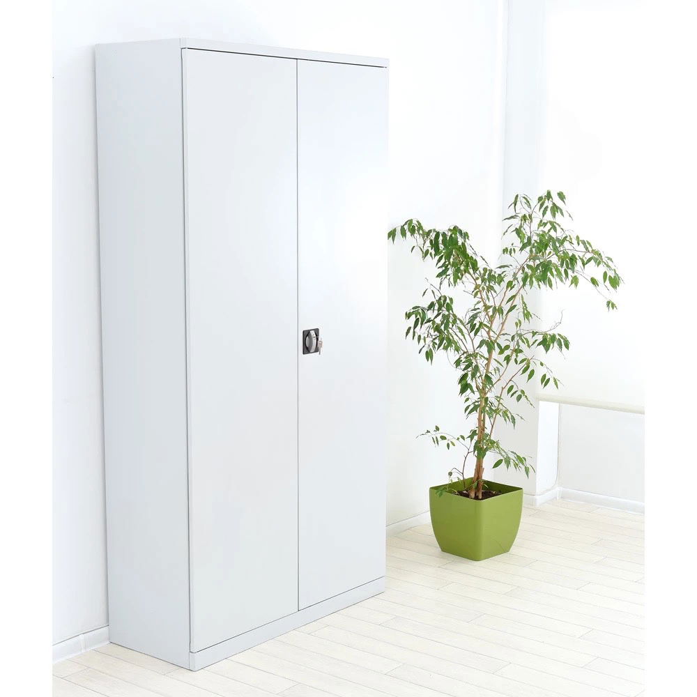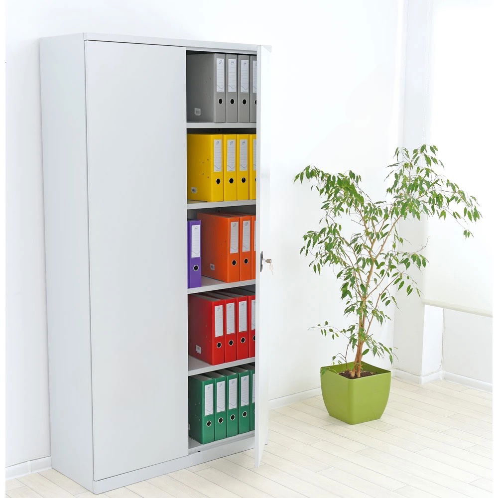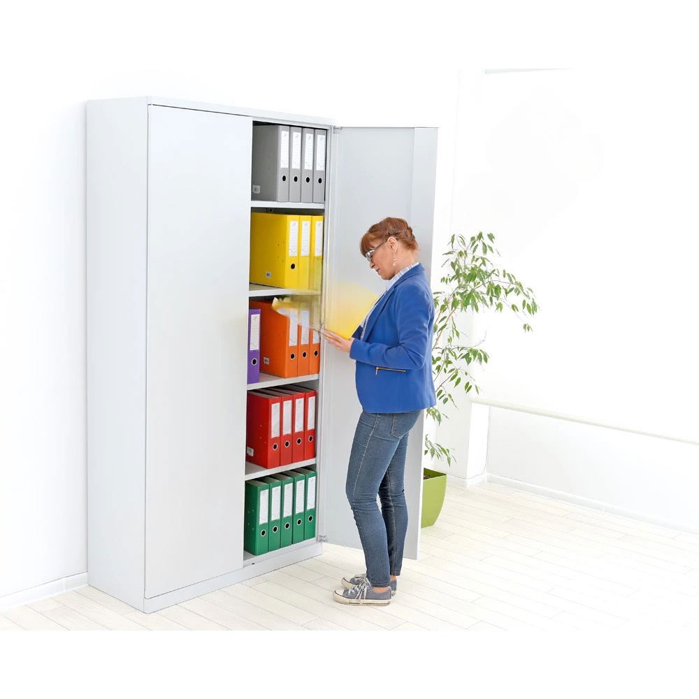 Anders als Holzschränke ist dieser Stahlschrank unempfindlich gegenüber Feuchtigkeit, Temperaturschwankungen und mechanischer Beanspruchung. Das grau lackierte Stahlblech ist kratzfest und leicht zu reinigen. Diese Robustheit macht ihn zur perfekten Wahl nicht nur für Büros, sondern auch für anspruchsvollere Umgebungen wie Werkstätten, Lagerhallen oder Kellerarchive. - Verstärkte Türen für erhöhte Sicherheit