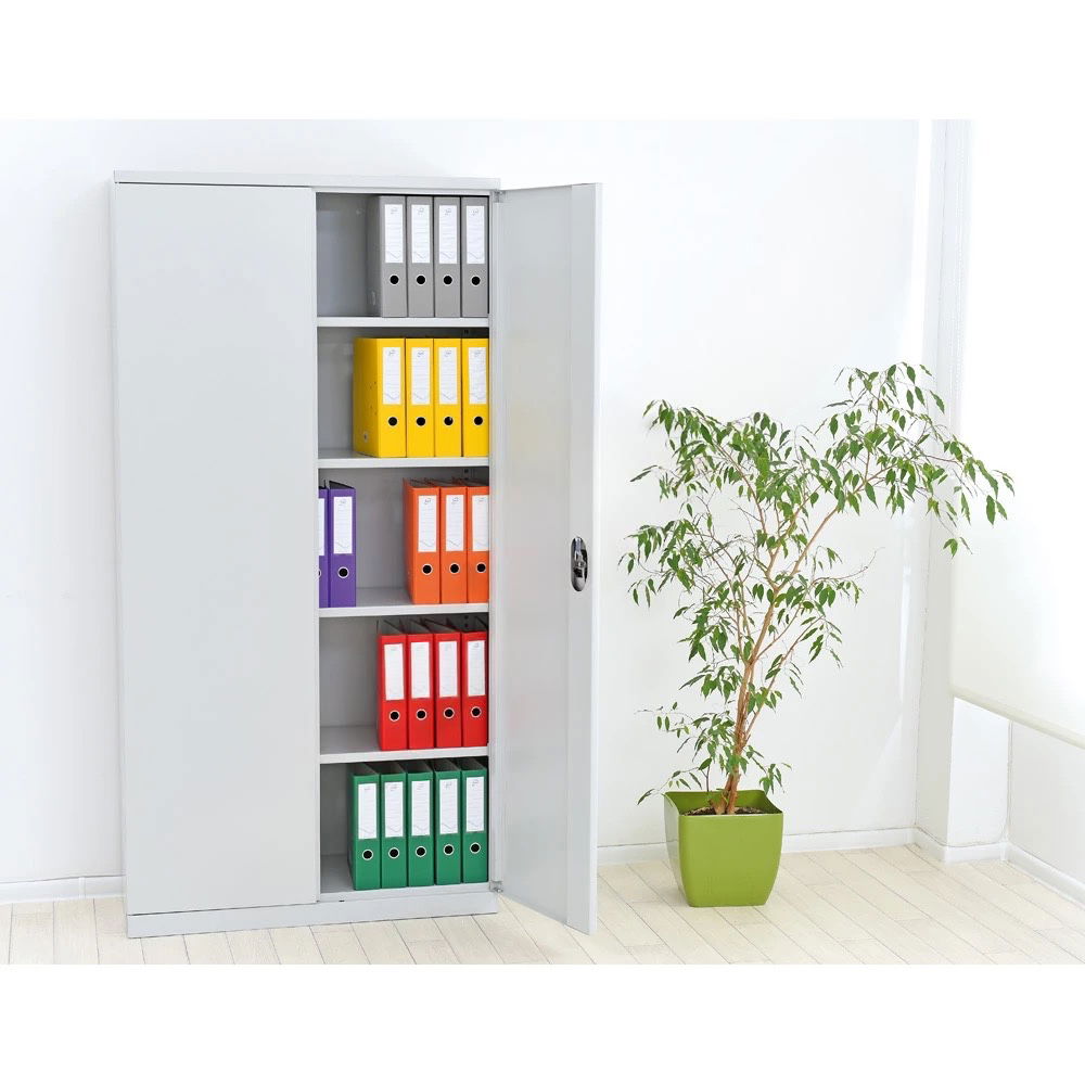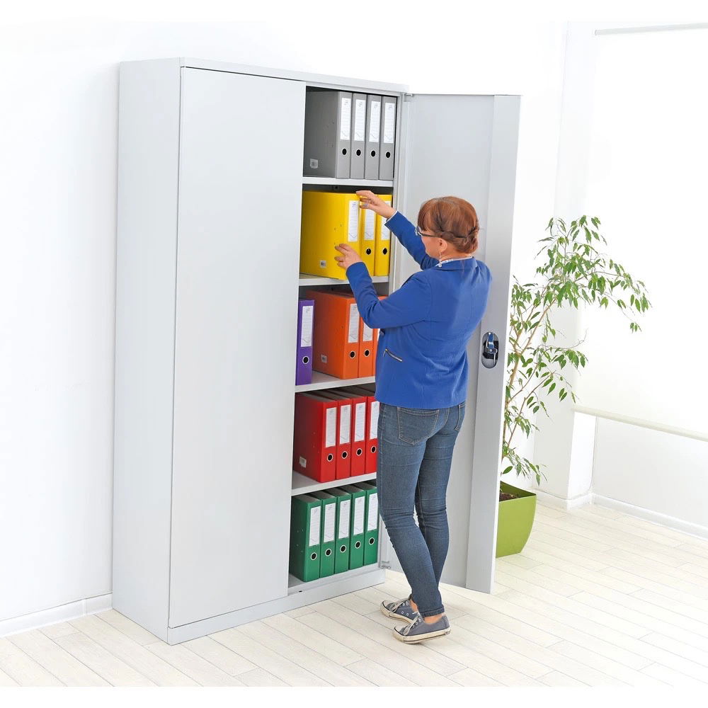 Der Schrank wird mit vier stabilen Einlegeböden geliefert. Diese lassen sich in der Höhe variieren, sodass Sie den Innenraum flexibel an Ihre spezifischen Lagergüter anpassen können. Egal ob hohe Ordner, flache Mappen oder sperrige Gegenstände – hier findet alles seinen passenden Platz.