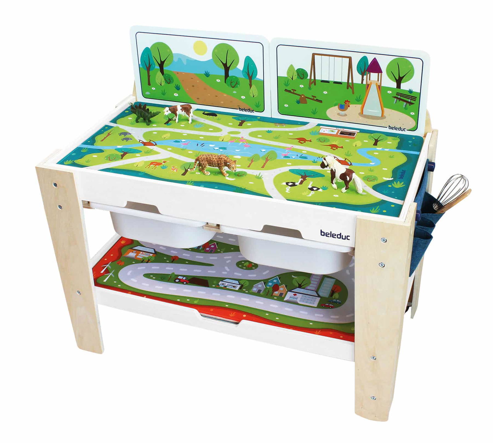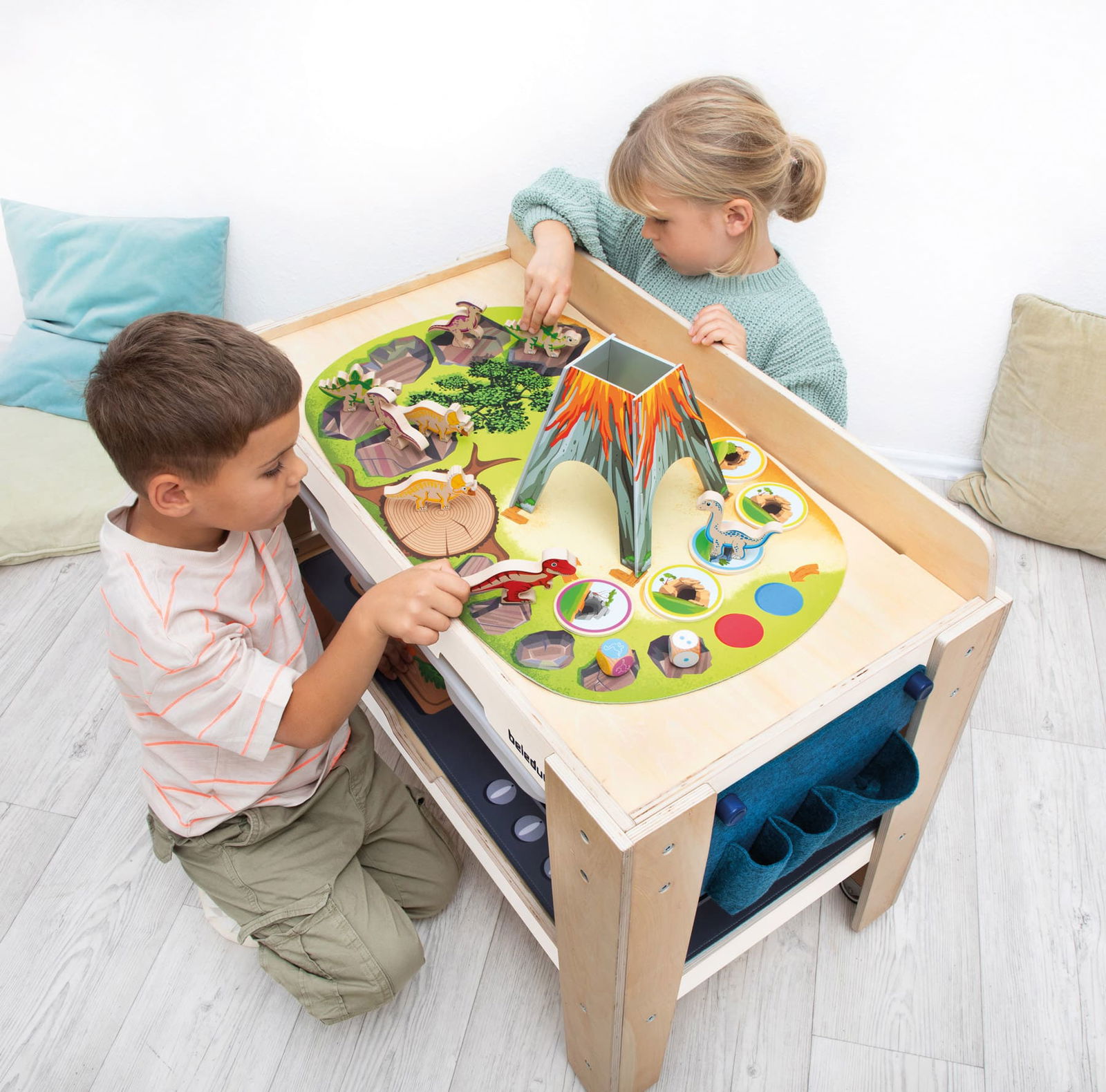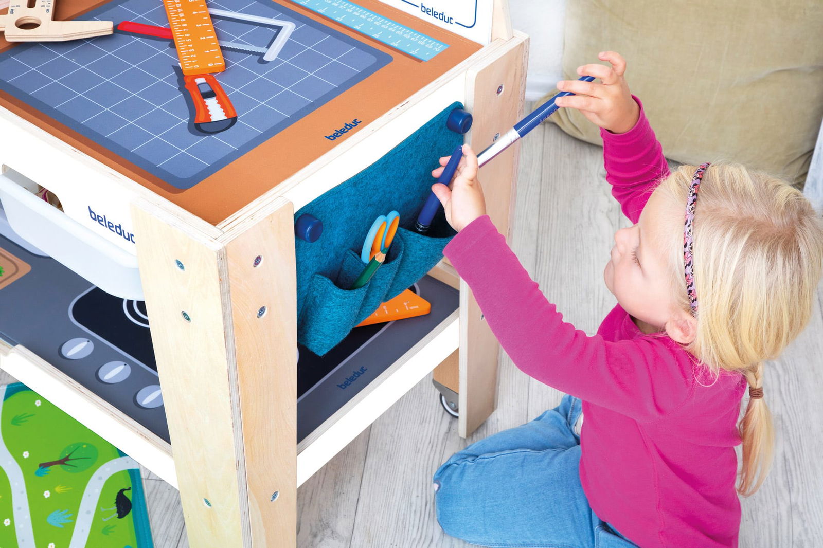 Spielen, aufräumen, fertig.- Integrierte Aufbewahrung: Zwei geräumige Kunststoffschubladen, eine große Ablage unter der Tischplatte und eine seitliche Filztasche bieten reichlich Platz für Spielzeug, Autos, Bausteine und Malutensilien.