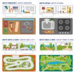Jeden Tag ein neues Abenteuer.- Vier wechselbare Themenmatten: Ob kochen in der Küche, hämmern in der Werkstatt, Autos fahren in der Stadt oder Tiere beobachten im Park – die liebevoll gestalteten Spielmatten und doppelseitig bedruckten Steckkarten bieten die perfekte Kulisse für vielfältige Rollenspiele.