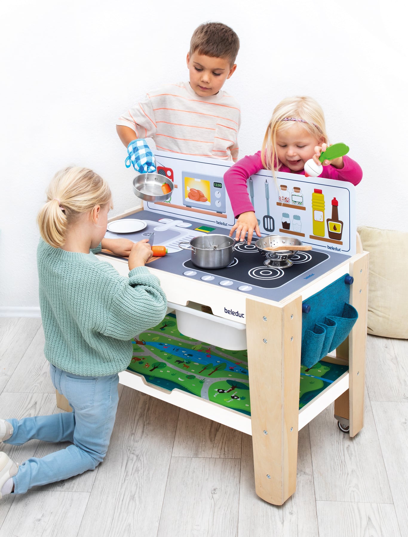 - Material: Holz, Kunststoff (Schubladen), Textil (Spielmatten), Filz (Tasche)