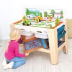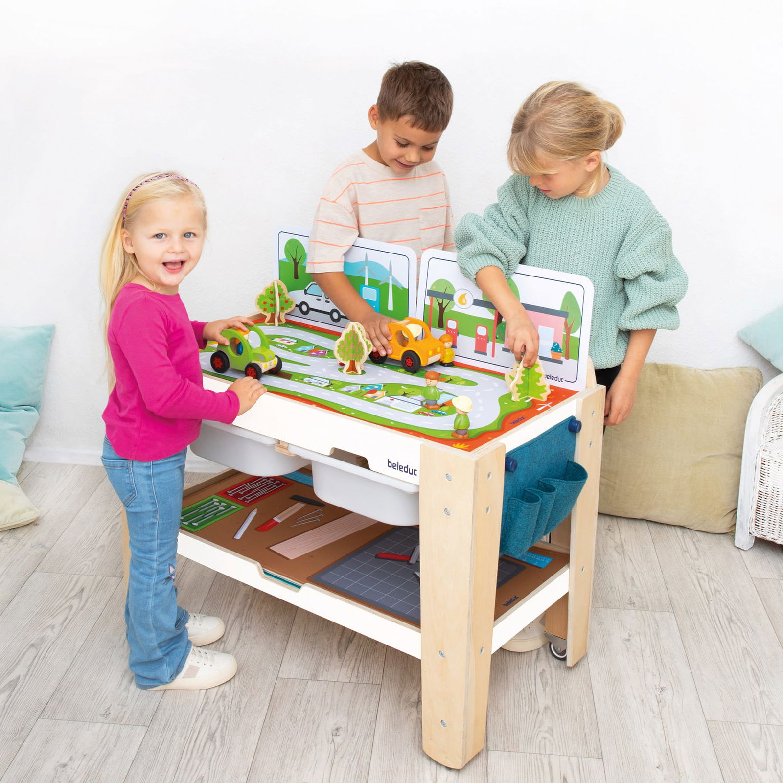 Dank der vier wechselbaren Spielmatten und passenden Kulissen-Steckkarten können immer wieder neue Szenarien geschaffen werden, die zum Rollenspiel, Bauen und Erzählen anregen. Doch der „Freeplay“ ist mehr als nur eine Spielfläche. Mit seinen integrierten Schubladen, der praktischen Filztasche und einer zusätzlichen Ablagefläche ist er auch ein wahres Organisationstalent. Spielzeug, Bausteine und Bastelmaterialien sind im Handumdrehen aufgeräumt, und dank der Rollen kann der Tisch flexibel dort eingesetzt werden, wo er gerade gebraucht wird.