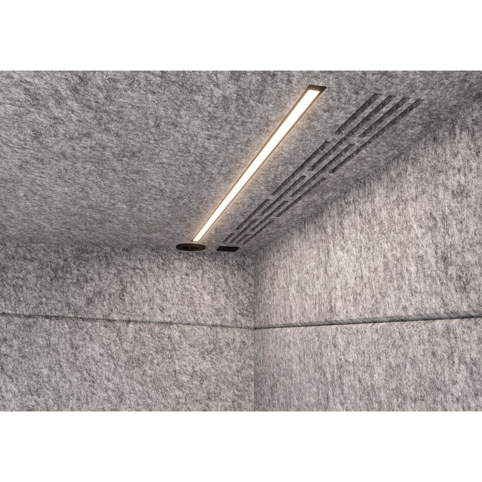 Komfort steht an erster Stelle: Ein durchdachtes Belüftungssystem mit einem leisen Deckenlüfter sorgt für einen stetigen Luftaustausch über ein Schall-Labyrinth, ohne Lärm von außen hereinzulassen. Sobald Sie die Box betreten, aktiviert ein Bewegungsmelder die LED-Lichtleiste. Das Licht dimmt sanft hoch, um die Augen zu schonen, und sorgt für eine angenehme Arbeitsatmosphäre. - Nachhaltige Materialien und durchdachtes Design