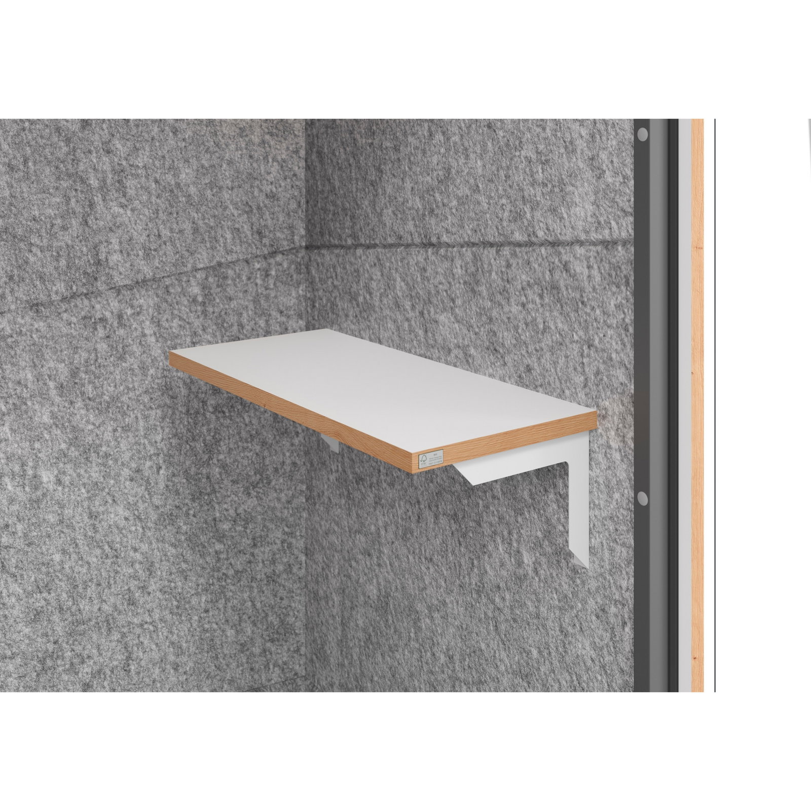 Der Kern der Box besteht aus doppelwandigen Wänden und Böden sowie speziellen Akustikmaterialien an Seiten und Decke. Diese Konstruktion schluckt Schallwellen effektiv und sorgt für eine spürbare Ruhe im Inneren. Gleichzeitig bleibt das Gespräch diskret in der Box. Die Tür aus 8 mm starkem Einscheibensicherheitsglas schließt dicht ab und trägt maßgeblich zur Schallisolierung bei. - Voll ausgestatteter Arbeitsplatz