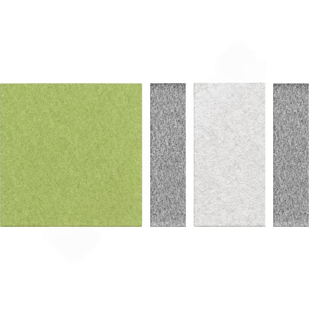 Das Set Lyra 2 besteht aus vier Paneelen in drei unterschiedlichen Größen, die sich zu einem dynamischen Gesamtbild (ca. 120 x 60 cm) zusammenfügen lassen. Die durchgefärbten PET-Filzplatten in modernen Farben ermöglichen kreative Arrangements – ob als Solitär an einer kleinen Wand oder als Teil einer großflächigen Installation in langen Fluren. - Nachhaltiges Material und einfache Montage