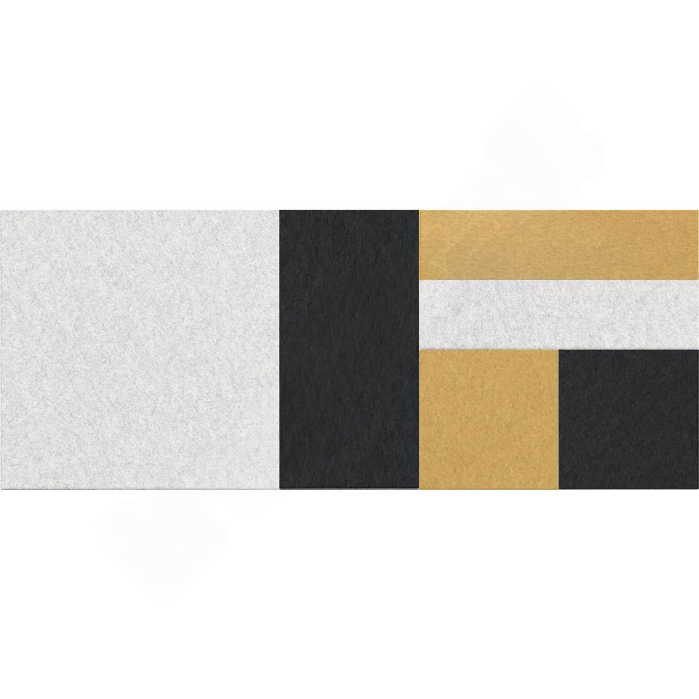 Gefertigt aus hochwertigem PET-Filz, überzeugt dieses Set nicht nur durch seine technischen Eigenschaften, sondern auch durch seine Ästhetik. Die Kombination aus verschiedenen geometrischen Formen und den harmonisch abgestimmten Farben FC107, FC412 und FC202 ermöglicht es Ihnen, individuelle Wandbilder zu kreieren. So wird der Schallschutz zum Designelement, das sich nahtlos in moderne Architektur einfügt und gleichzeitig für eine angenehme Ruhe sorgt.