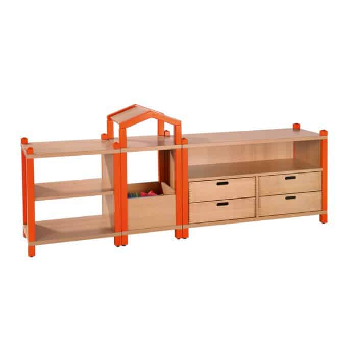 Entdecken Sie das ALEX Regalsystem, eine charmante und hochfunktionale Möbelkombination, die Ordnung schafft und gleichzeitig als fantasievolle Spielkulisse dient. Dieses dreiteilige Ensemble, bestehend aus einem verspielten Türmchen mit Dachaufsatz, einem praktischen Regal mit vier Massivholzschüben und einem weiteren offenen Regal, ist die perfekte Lösung für lebendige Räume. ALEX fungiert nicht nur als großzügiger Stauraum für Spielzeug, Bastelmaterial und Rucksäcke, sondern kann dank seiner durchdachten Form auch ideal als Raumteiler eingesetzt werden. Mit seiner TÜV- und GS-zertifizierten Sicherheit und der robusten Konstruktion aus massivem Buchenholz ist das ALEX Regalsystem die ideale, langlebige Wahl für Kindergärten, Spielgruppen und jedes fantasievoll gestaltete Kinderzimmer.