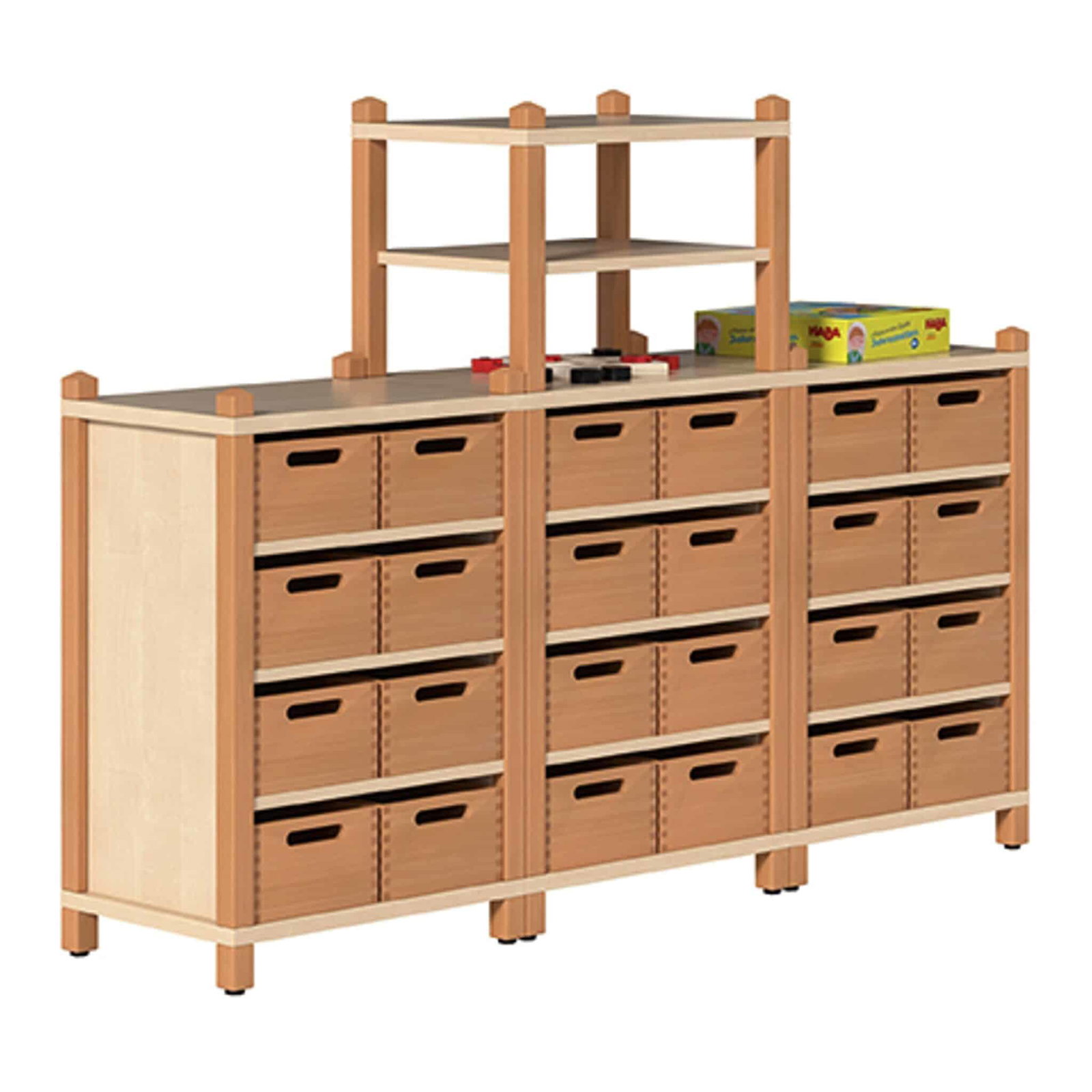 - Persönlicher Stauraum für jedes Kind: Dieses Set enthält zwei Eigentumsschränke mit je 8 Materialkästen sowie einen kombinierten Schrank mit Regal und 8 weiteren Eigentumskästen. Jedes Kind erhält seinen eigenen, klar definierten Platz, was die Selbstständigkeit und das Verantwortungsgefühl fördert.
