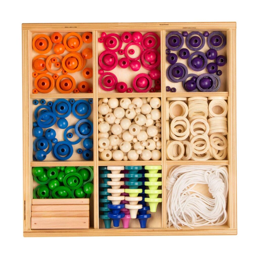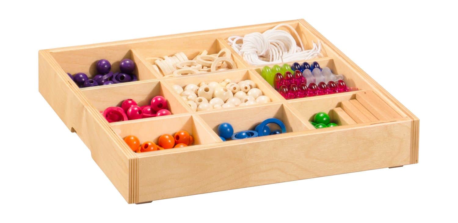 Die verschiedenen Sets können mit eigenen Materialien ergänzt werden, sodass das Lernen immer abwechslungsreich und spannend bleibt. Durch das Auffädeln der 32 weißen Perlsenkel in insgesamt drei Größen und das Arbeiten mit den 10 Strickleitertreppen wird nicht nur die Feinmotorik gefördert, sondern auch das Verständnis für mathematische Zusammenhänge geübt.