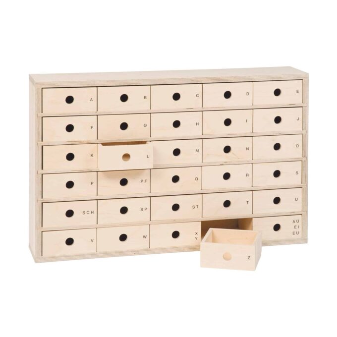 Der Anlautschrank ist mit 30 herausnehmbaren Schubladen ausgestattet, die jeweils 13 x 12,5 x 6 cm groß sind und mit 1, 2 bzw. 3 Anlauten beschriftet sind. Diese Struktur ermöglicht es den Kindern, die Anlaute spielerisch zu erkunden und so ihre phonologische Bewusstheit zu fördern. Durch das Greifen und Herausnehmen der Schubladen lernen die Kinder, Laute zu erkennen und gezielt zuzuordnen, was die Grundlage für das Lesen und Schreiben bildet.