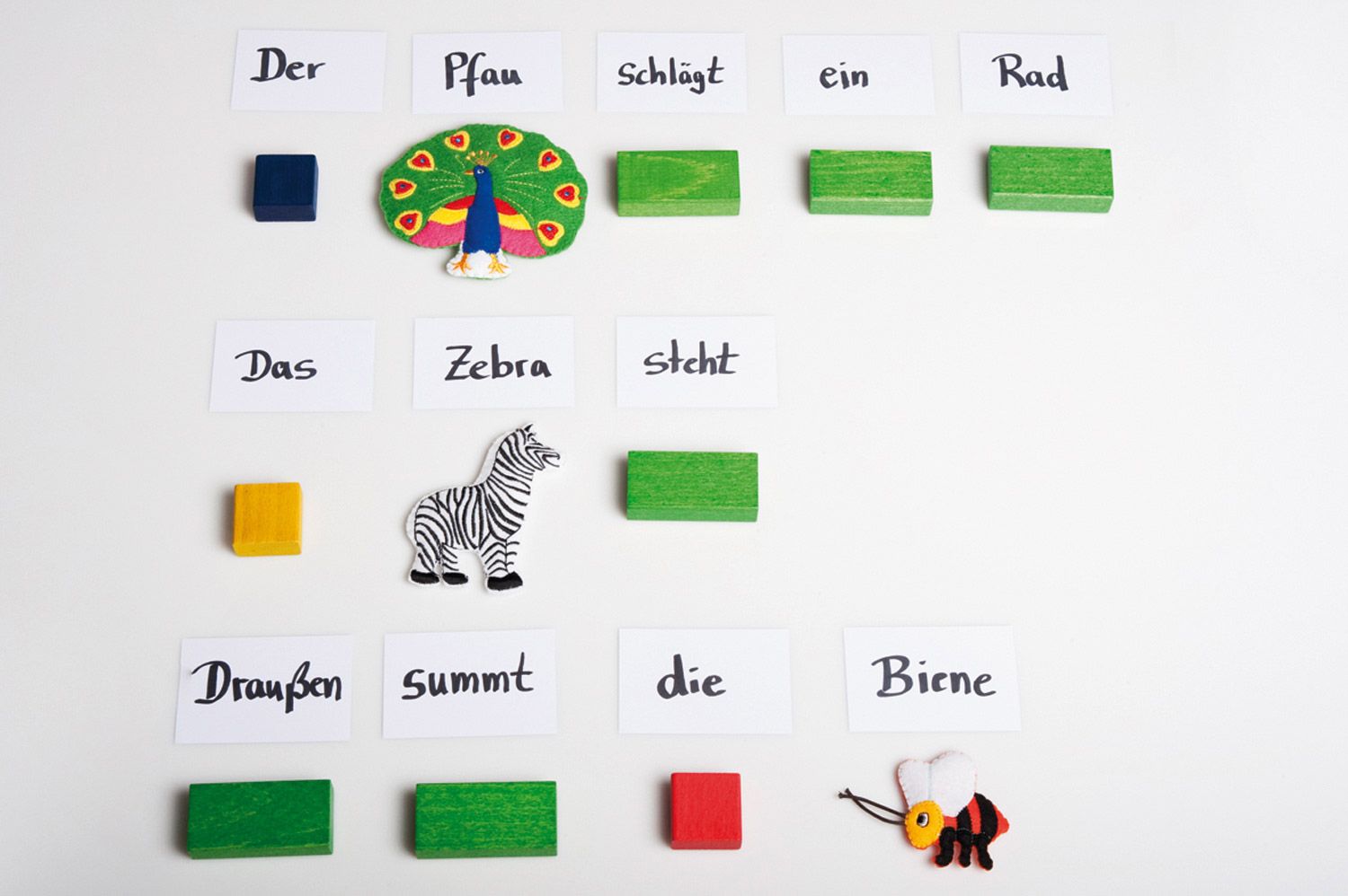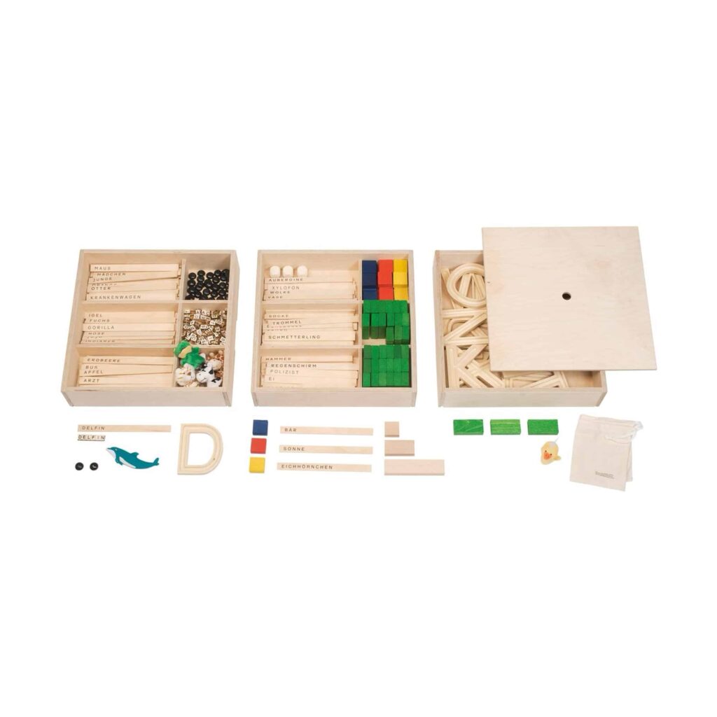 Das Angebot umfasst zudem 29 Erfahrungsbuchstaben (ca. 13 cm hoch) aus Birke Multiplex, 40 schwarze Silbensteine aus Kunststoff für präzise Übungen, sowie 36 Wortbausteine aus grünem Vollholz, die die Wortschatzentwicklung fördern. Die Fingerpüppchen und Wortlängensteine (klein, mittel, groß) unterstützen das spielerische Erkunden und den Umgang mit Sprache.