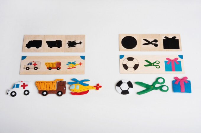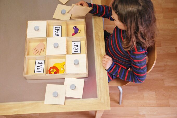 Um das Gedächtnis weiter zu trainieren, liegen im Set 16 Vorher-Nachher-Karten (laminiert) bei, die zwei zusammengehörige Bilder zeigen. Diese Karten helfen den Kindern, Unterschiede wahrzunehmen und ihre Aufmerksamkeit auf Details zu schärfen. Die vollständige Aufbewahrung erfolgt in einer stapelbaren Kiste aus Birke Multiplex.