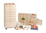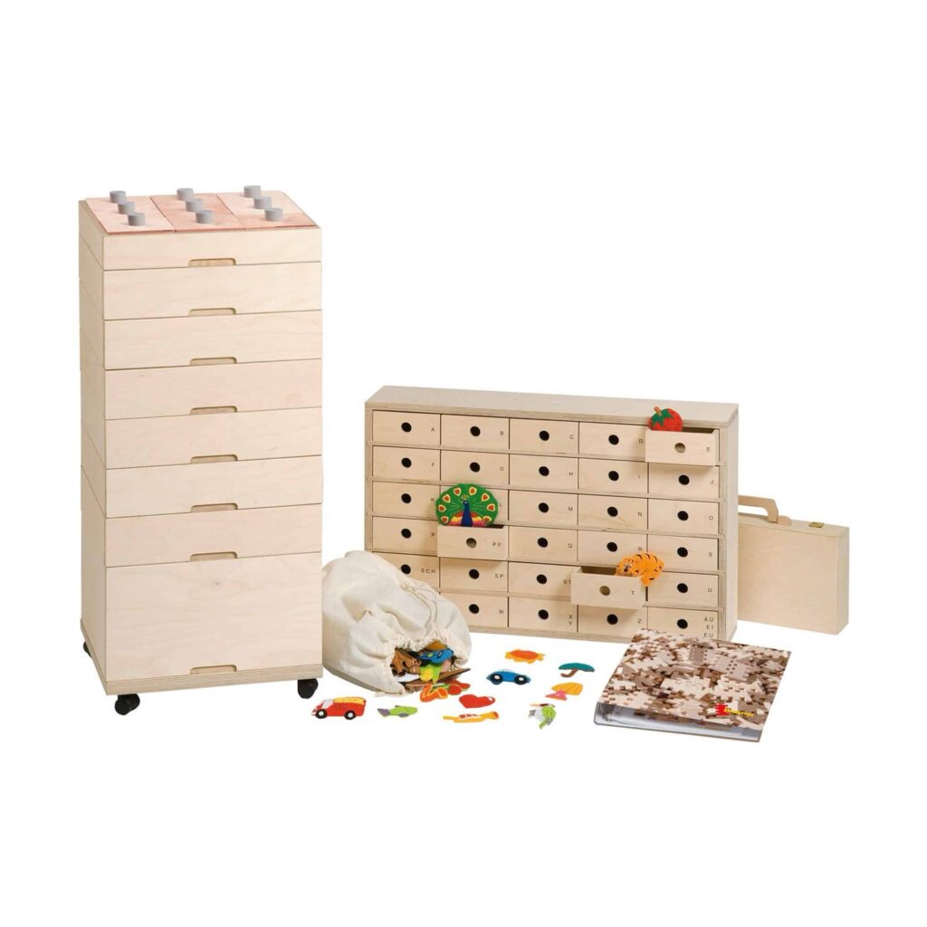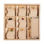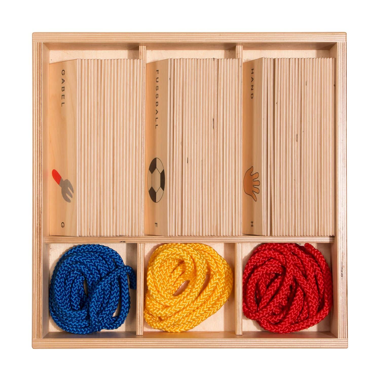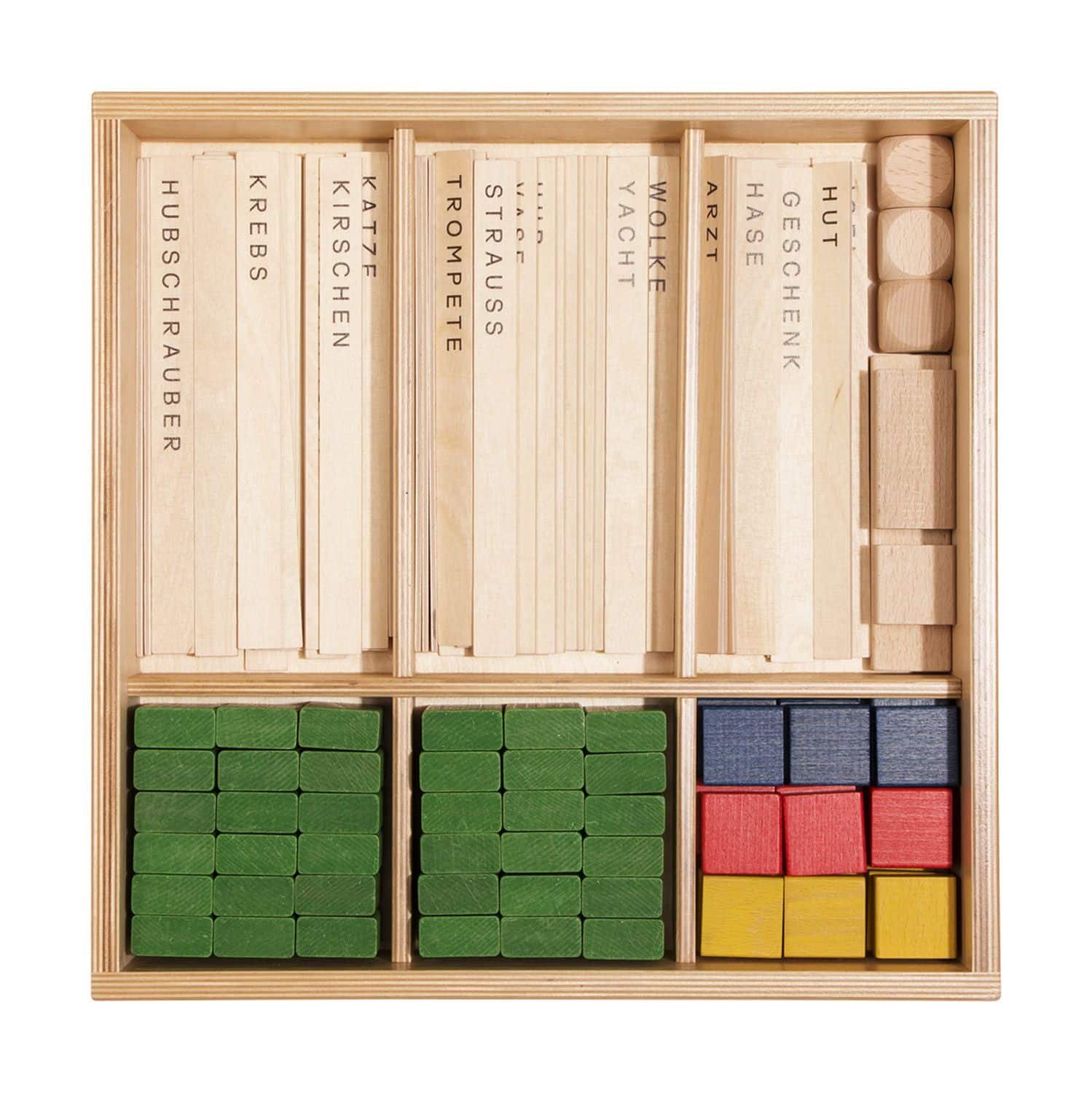 Das Set besteht aus robustem Birke Multiplex, Vollholz, Holz, Karton und Kunststoff, wodurch eine hohe Langlebigkeit und Sicherheit gewährleistet ist. Der Kistenturm hat die Maße von 37 x 37 x 133 cm, und der Anlautschrank misst 66 x 42 x 13,5 cm. Der praktische Koffer (25 x 18,5 x 9 cm) sorgt für eine ordentliche Aufbewahrung der Materialien.