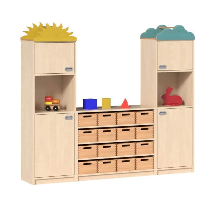 Bringen Sie einen Hauch von Magie und perfekte Organisation in Ihre Räume! Das Regalsystem „ARIANA“ ist weit mehr als nur ein Stauraumwunder – es ist eine fantasievoll gestaltete Möbelwand, die zum Träumen und Ordnen einlädt. Mit seinen charmanten Dachaufsätzen in Wolken- und Sonnenform wird es zum absoluten Blickfang in jeder Einrichtung. Darunter verbirgt sich ein hochfunktionales System aus 16 praktischen Materialkästen und vier Schranktüren, das für eine unübertroffene Übersichtlichkeit sorgt. Dank der GS-geprüften Qualität vom TÜV Rheinland verbindet „ARIANA“ spielerisches Design mit kompromissloser Sicherheit und robuster Langlebigkeit für den anspruchsvollen Alltag in Krippe, Kindergarten und Grundschule.