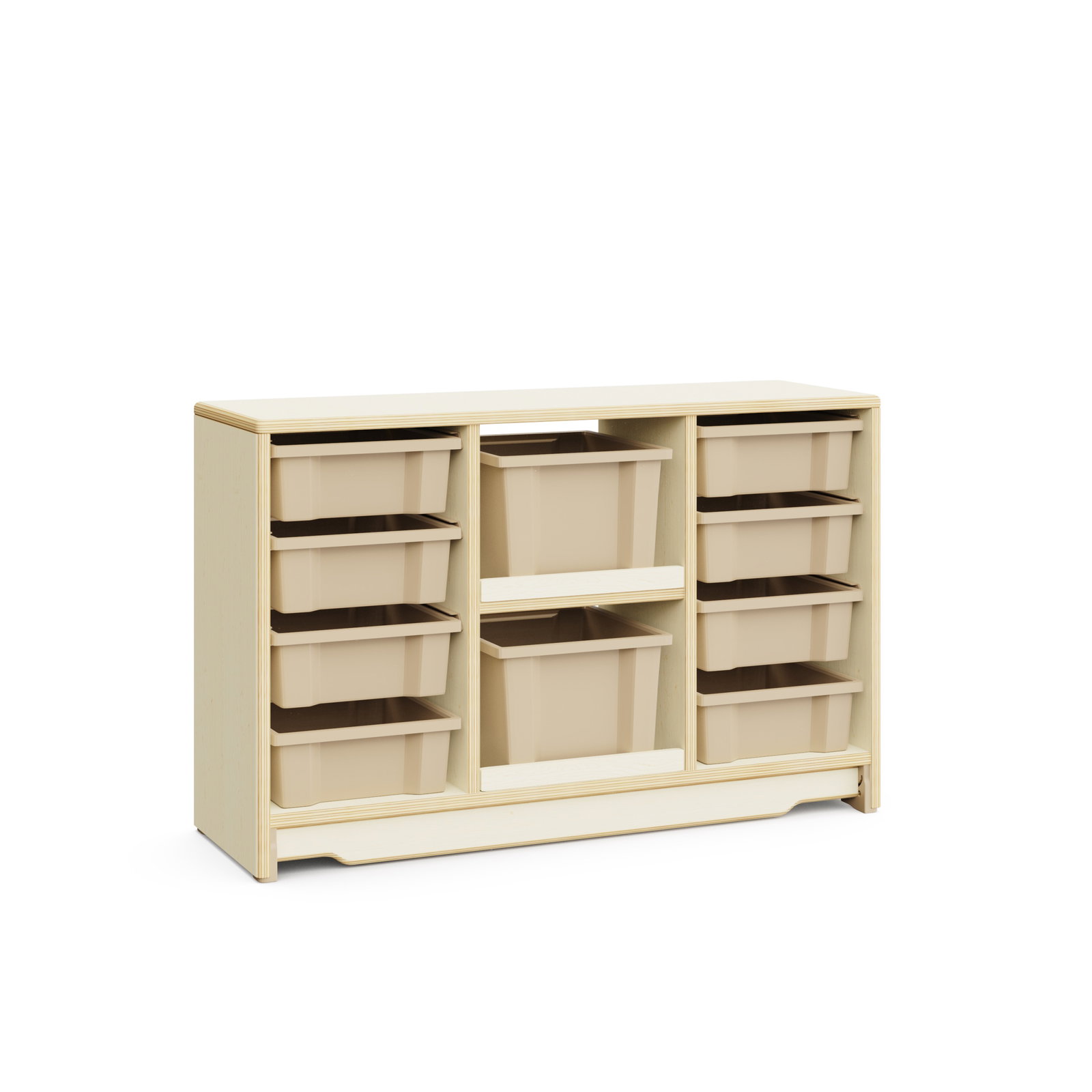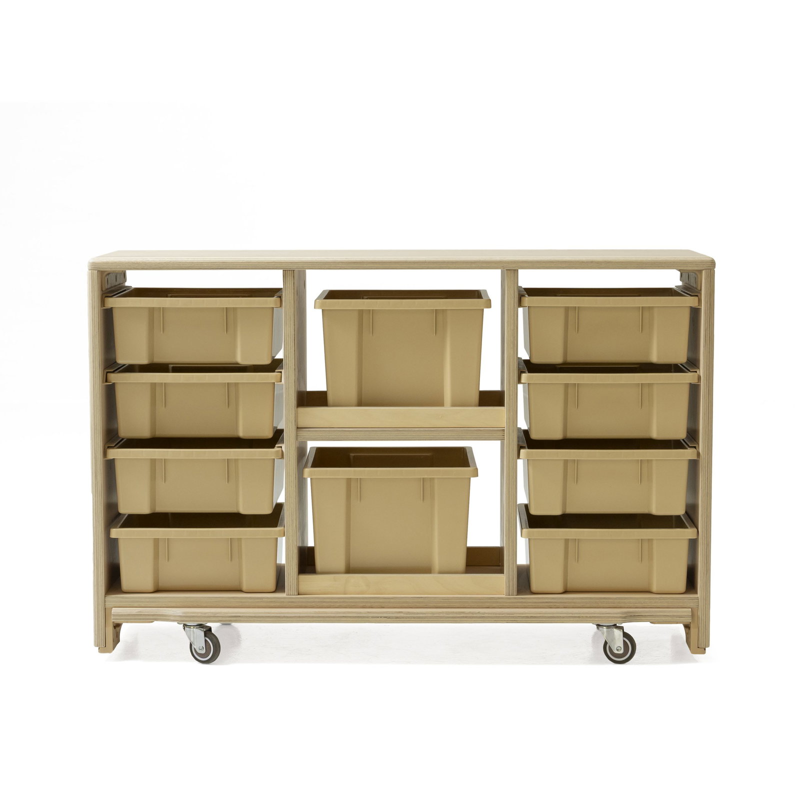 Der Korpus aus hochwertigem Birken-Sperrholz sorgt für eine natürliche, beruhigende Atmosphäre im Raum und bietet gleichzeitig die nötige Stabilität für den lebhaften Bildungsalltag. Ein wesentliches Merkmal ist die durchdachte Fächeraufteilung: Der Wagen verfügt über zehn praktische Aufbewahrungsfächer, die mit robusten, beigefarbenen Kunststoffboxen ausgestattet sind. Acht flache und zwei hohe Behälter bieten Ihnen den idealen Stauraum für Materialien unterschiedlichster Größe.