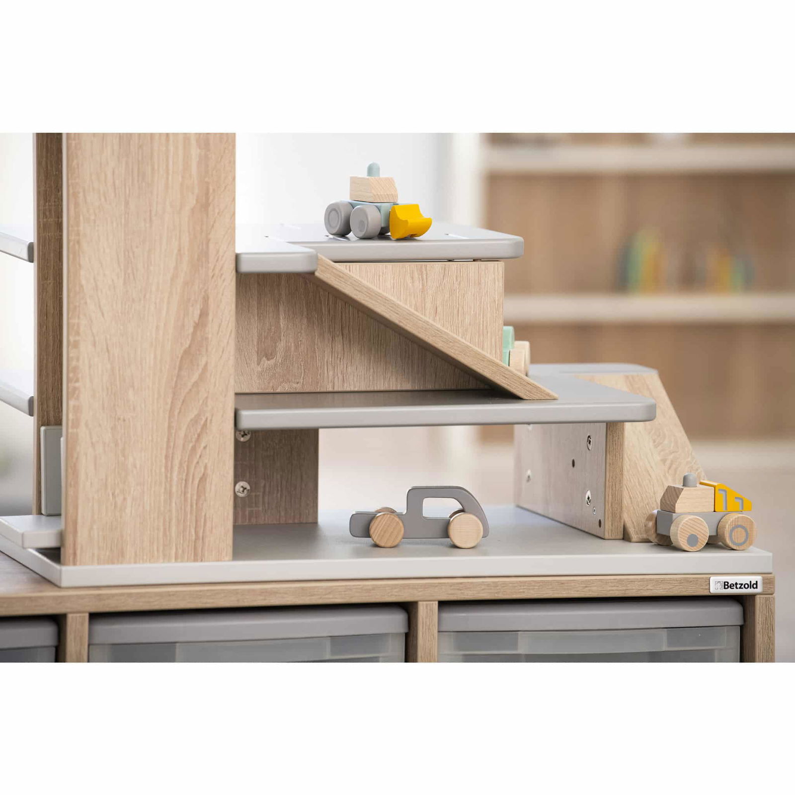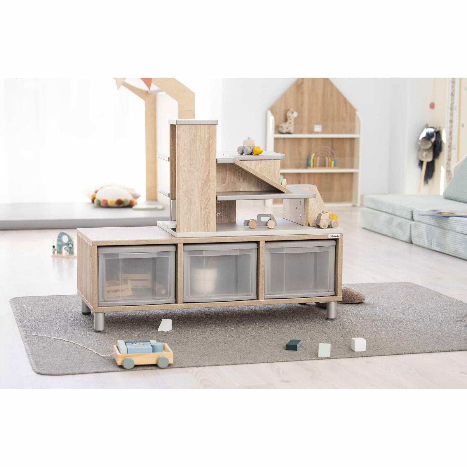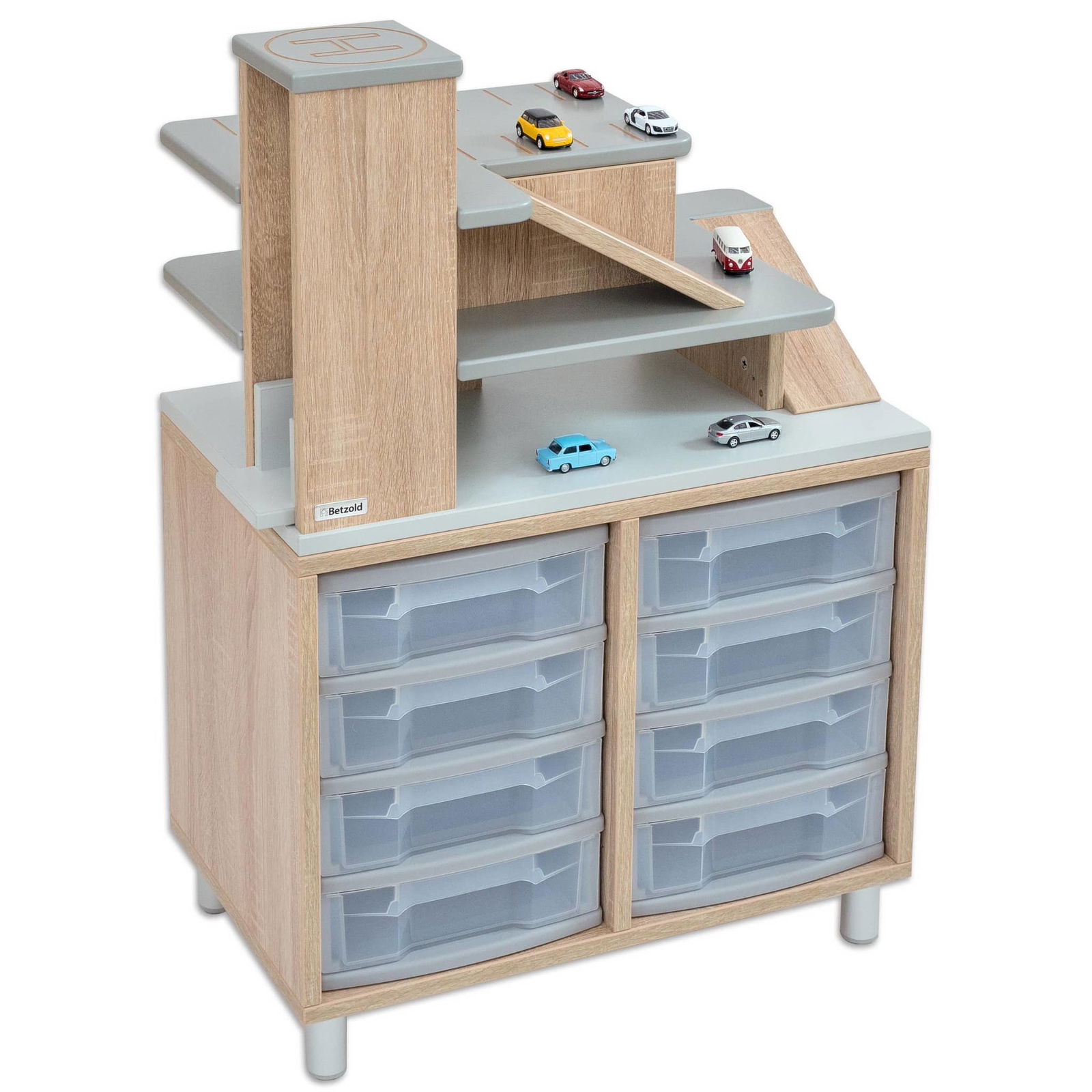 Willkommen beim Betzold Aufsatz Parkhaus! Dieser aufregende Regalaufsatz für EduCasa Regalsysteme verwandelt Ihr Regal in ein Spielparadies für Auto-Fans und sorgt für kreativen Spielspaß. Mit einem praktischen Aufzug, der über drei Stockwerke verfügt, und liebevoll gestalteten Rampen, bietet der Parkhausaufsatz nicht nur eine tolle Möglichkeit zum Spielen, sondern fördert auch die Motorik der Kinder, indem sie ihre Fahrzeuge spielerisch bewegen und einparken.