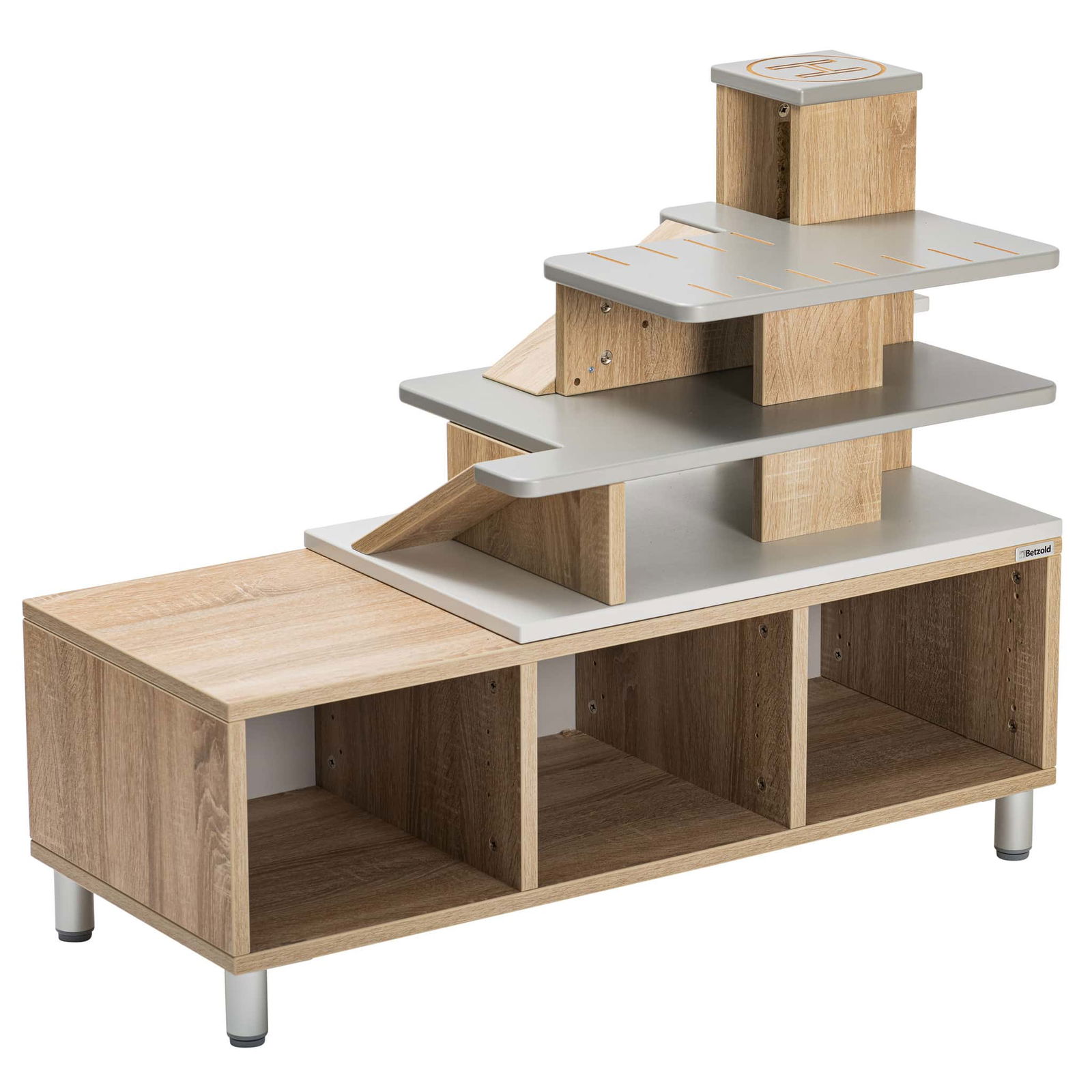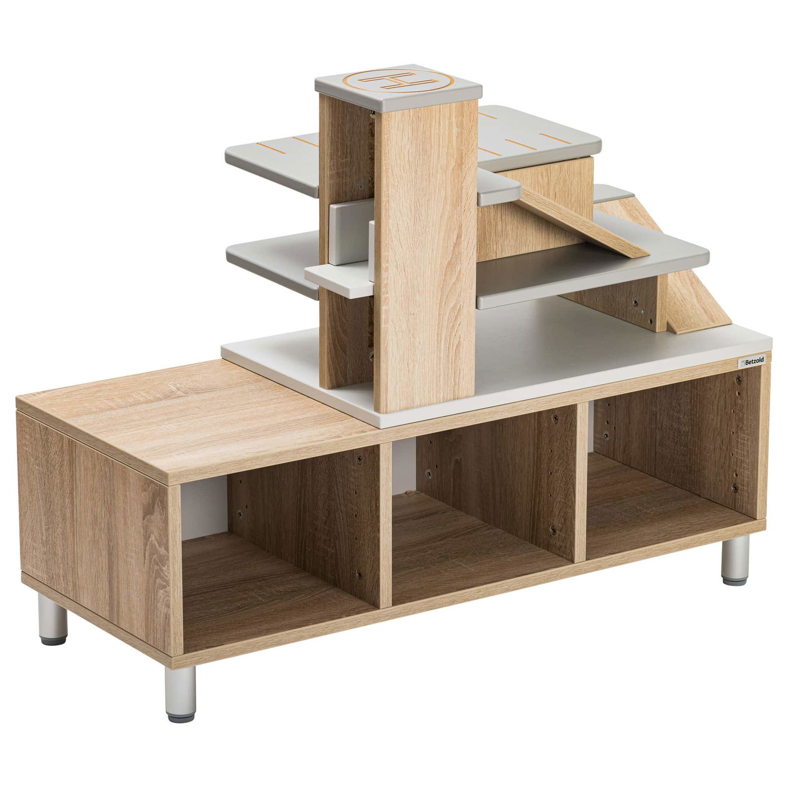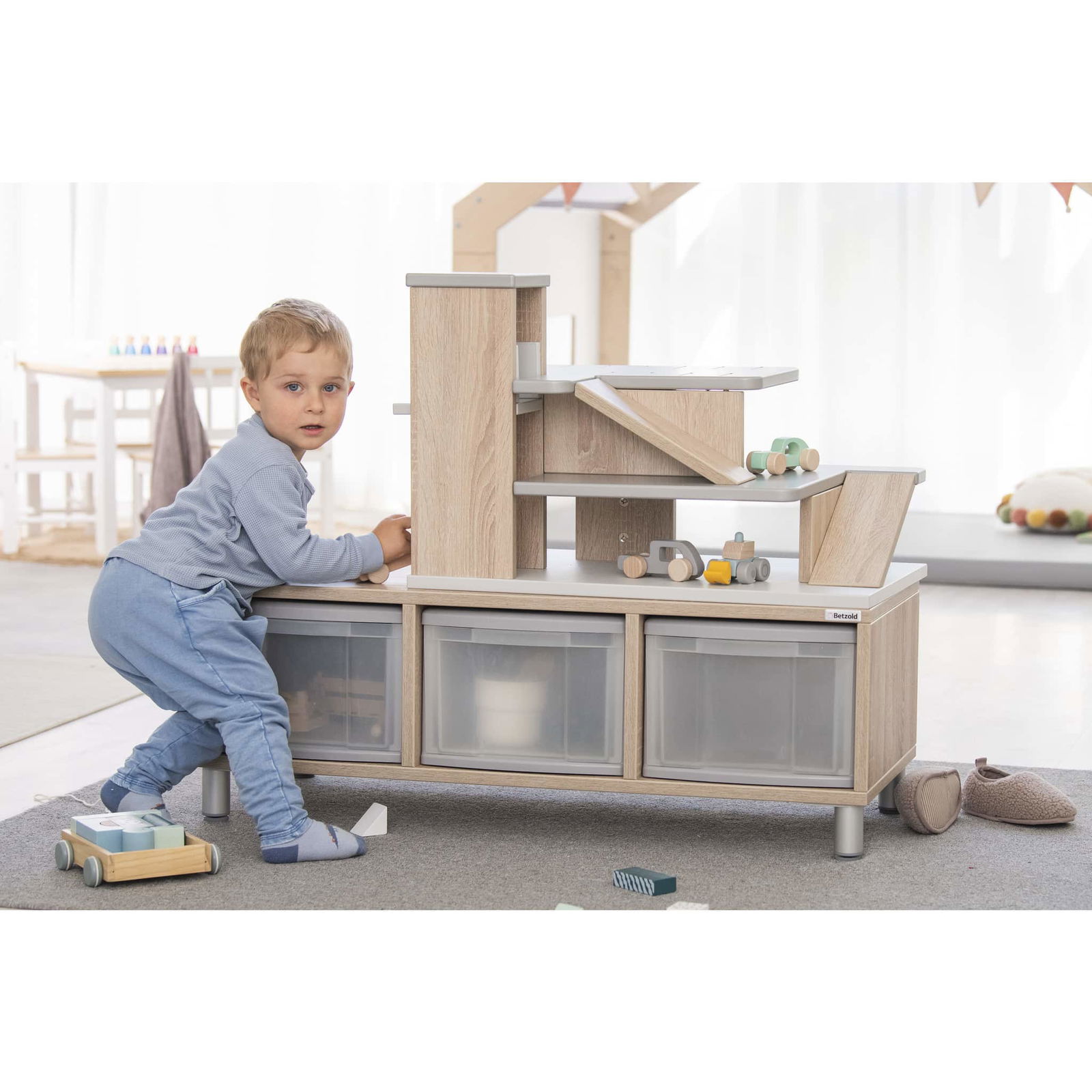 Willkommen beim Betzold Aufsatz Parkhaus! Dieser aufregende Regalaufsatz für EduCasa Regalsysteme verwandelt Ihr Regal in ein Spielparadies für Auto-Fans und sorgt für kreativen Spielspaß. Mit einem praktischen Aufzug, der über drei Stockwerke verfügt, und liebevoll gestalteten Rampen, bietet der Parkhausaufsatz nicht nur eine tolle Möglichkeit zum Spielen, sondern fördert auch die Motorik der Kinder, indem sie ihre Fahrzeuge spielerisch bewegen und einparken.