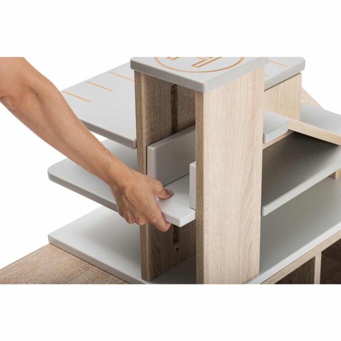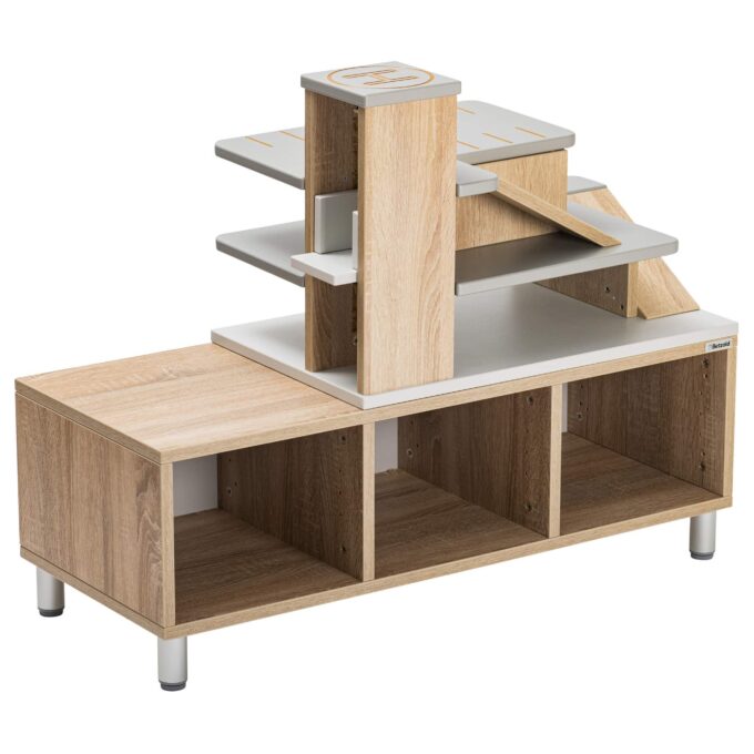 - Ordnungsgefühl: Der Aufsatz sorgt für einen aufgeräumten Spielbereich, da der Spielplatz direkt auf dem Regal integriert wird.