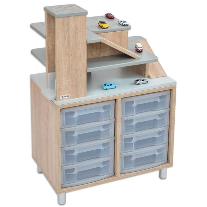 Willkommen beim Betzold Aufsatz Parkhaus! Dieser aufregende Regalaufsatz für EduCasa Regalsysteme verwandelt Ihr Regal in ein Spielparadies für Auto-Fans und sorgt für kreativen Spielspaß. Mit einem praktischen Aufzug, der über drei Stockwerke verfügt, und liebevoll gestalteten Rampen, bietet der Parkhausaufsatz nicht nur eine tolle Möglichkeit zum Spielen, sondern fördert auch die Motorik der Kinder, indem sie ihre Fahrzeuge spielerisch bewegen und einparken.