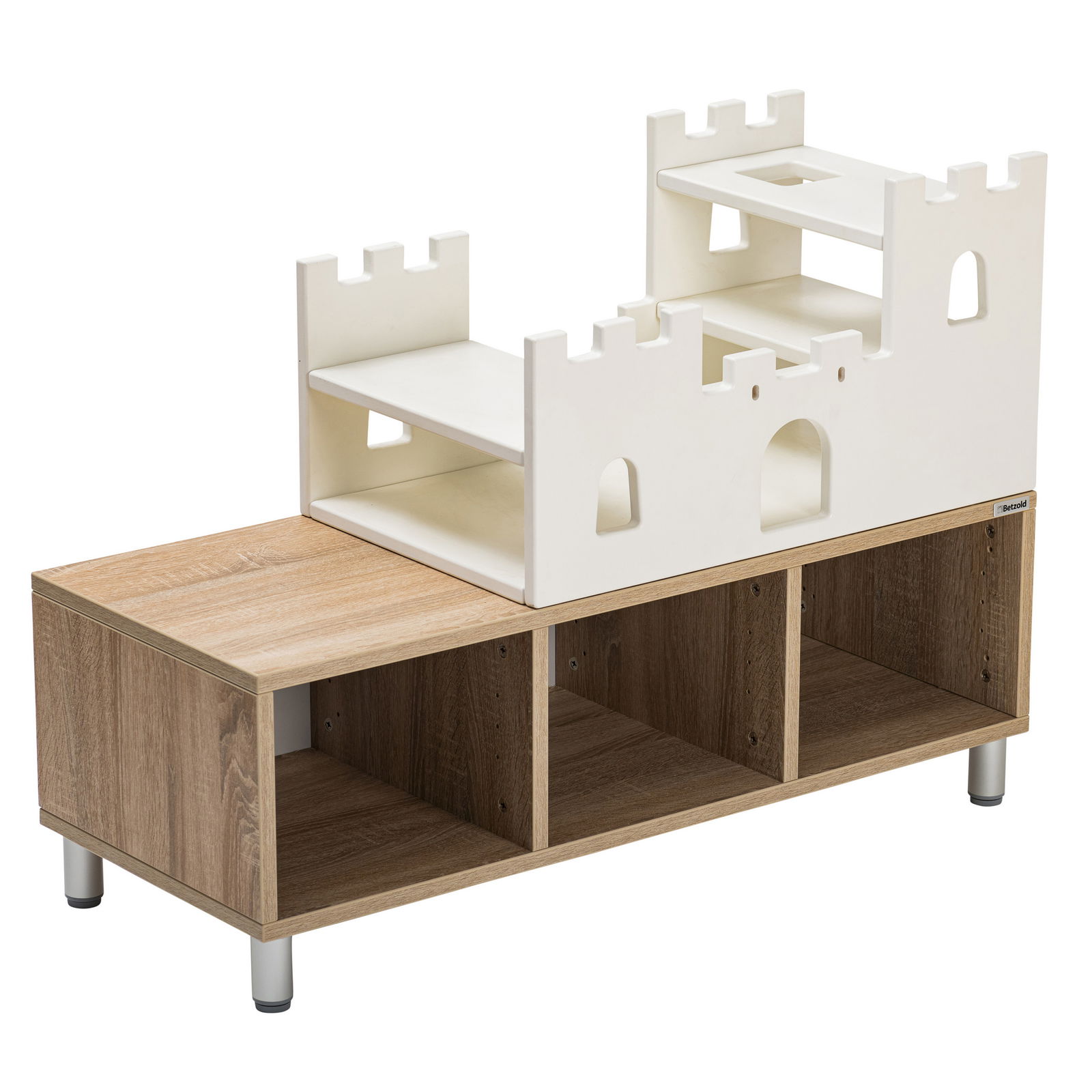 Das Besondere an diesem Spielmöbel ist seine Integration in den Alltag. Statt einer großen, sperrigen Ritterburg, die oft im Weg steht, nutzt dieser Aufsatz den vorhandenen Platz auf einem 2er-Regalelement effizient aus. Auf drei spannenden Ebenen können Kinder ihre Spielfiguren strategisch platzieren, Turniere austragen oder den Königshof versammeln. Das schlichte, weiße Design in Burgenoptik lässt dabei genug Raum für die eigene Vorstellungskraft und fügt sich harmonisch in jede moderne Einrichtung ein. Hier werden Geschichten lebendig, und das Aufräumen wird zur Nebensache, wenn das Regal selbst zur Spielwiese wird.