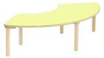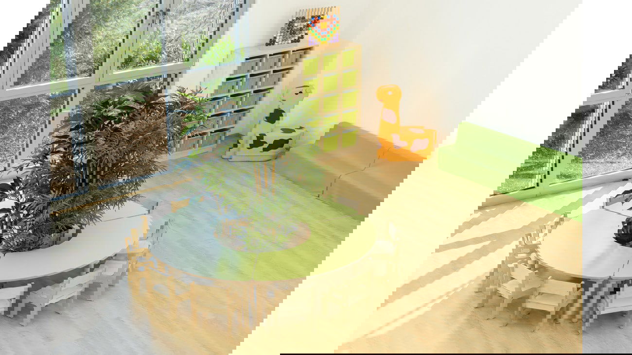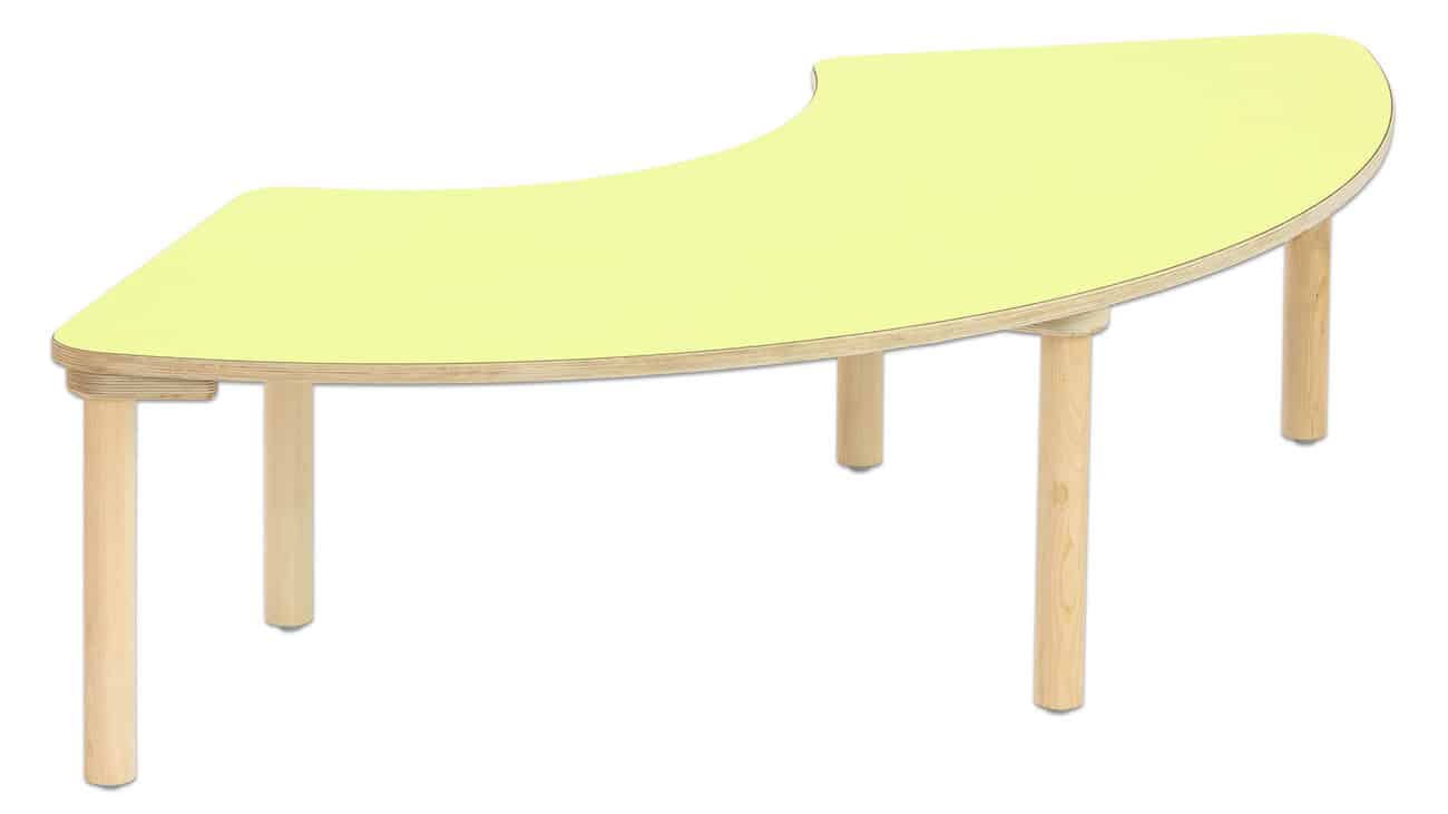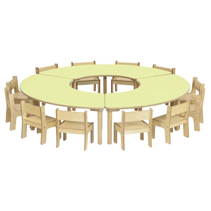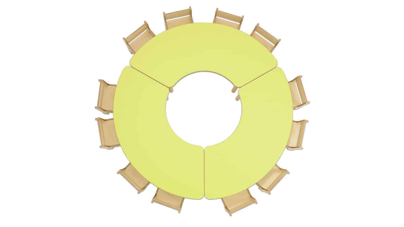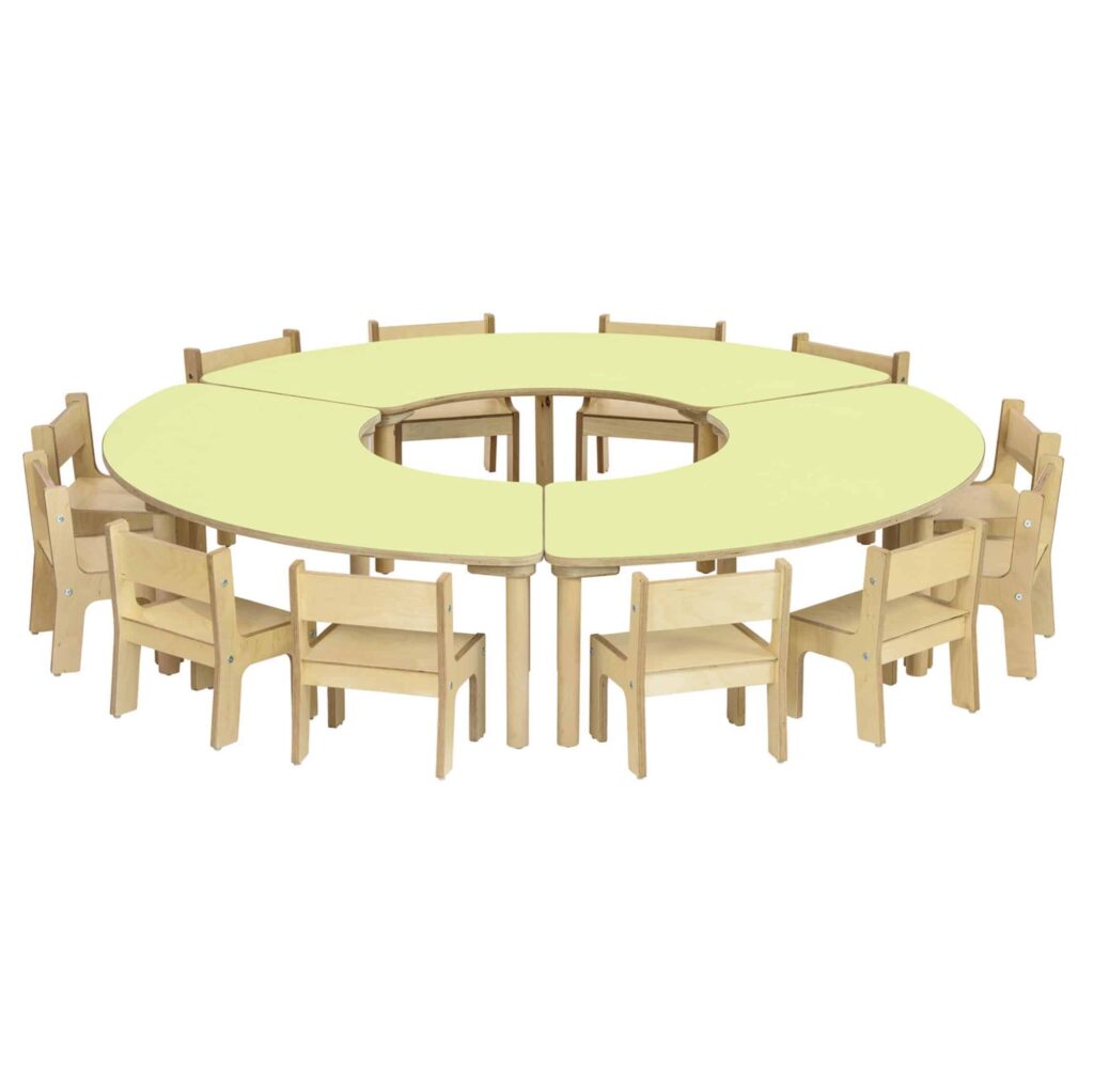Die Segmenttische und Stühle sind aus hochwertigem Material gefertigt, das den Anforderungen des Kindergartenalltags standhält. Die widerstandsfähige Tischplatte aus Birke Multiplex ist beidseitig mit Schichtstoff HPL beschichtet, was sie besonders unempfindlich gegenüber Kratzern und Abnutzung macht. Darüber hinaus sorgen die stark abgerundeten Ecken (50 mm) für zusätzliche Sicherheit beim Spielen und Lernen.
