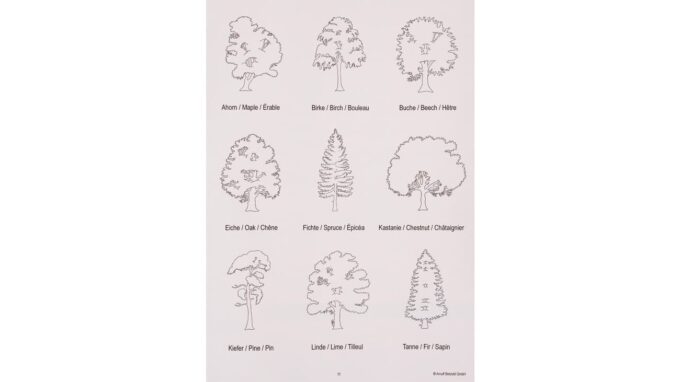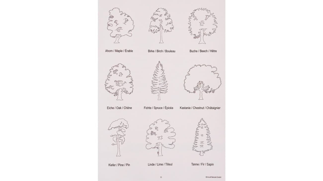 - 9 Bäume (Ahorn, Birke, Buche, Eiche, Fichte, Kastanie, Kiefer, Linde, Tanne) – kleinster Baum: 18,1 cm, größter Baum: 36 cm