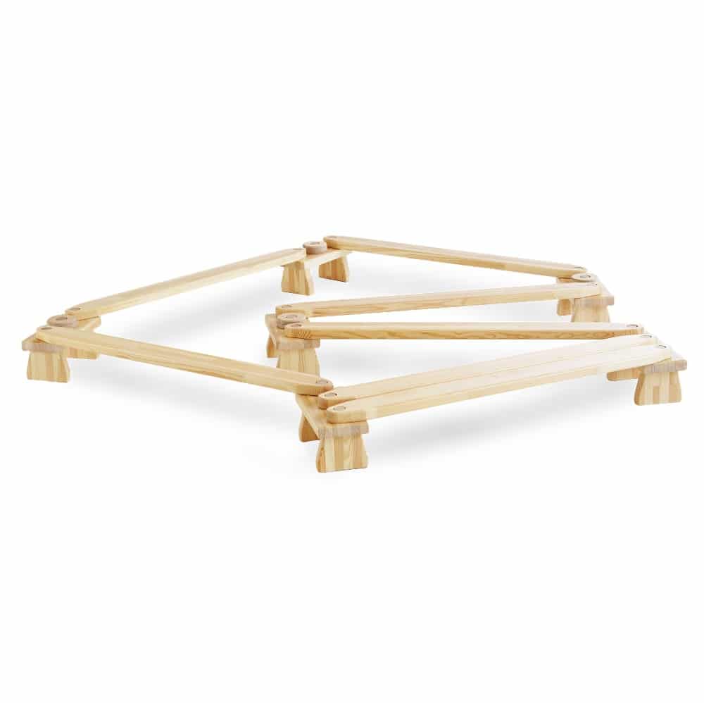 Die Standböckchen sind mit 3 Zapfen zum Fixieren der Balancierbretter versehen. Die Balancierbretter sind 107 cm lang, 9 cm breit, die Böckchen sind 30 cm lang, 14 cm breit und 13,5 cm hoch.