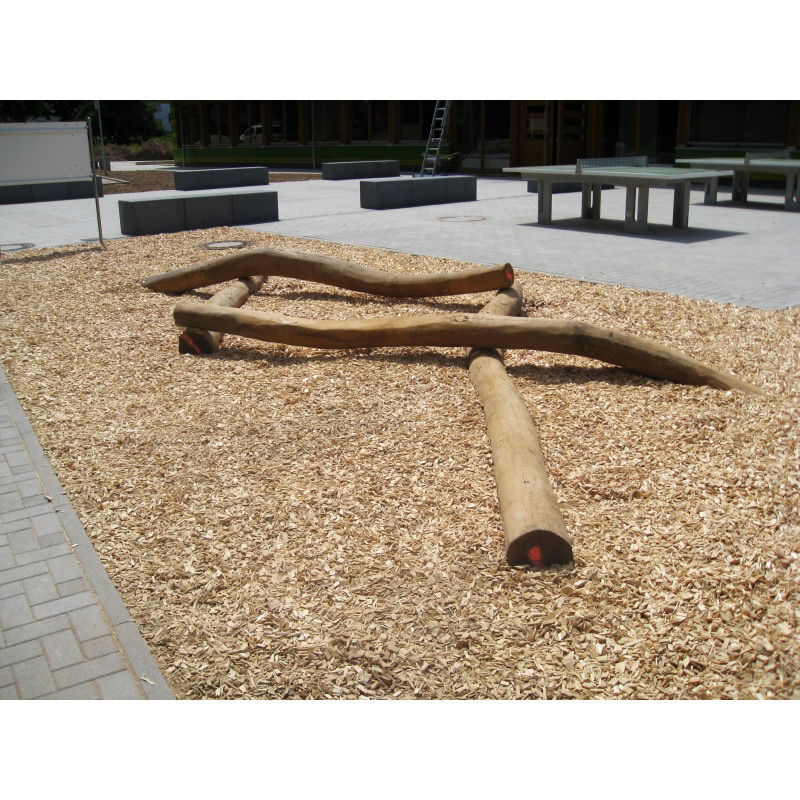 „Drunter und drüber“: Je krummer die Stämme, desto mehr Spaß macht das Balancieren darauf. Hier werden Konzentration und Gleichgewichtssinn geschult. Der Balancierzopf kann in einem beliebigen Winkel montiert werden. Die unteren Stämme werden mit Erdnägeln befestigt. Darauf werden die beiden Querstämme gelegt und ebenfalls mit Erdnägeln befestigt.