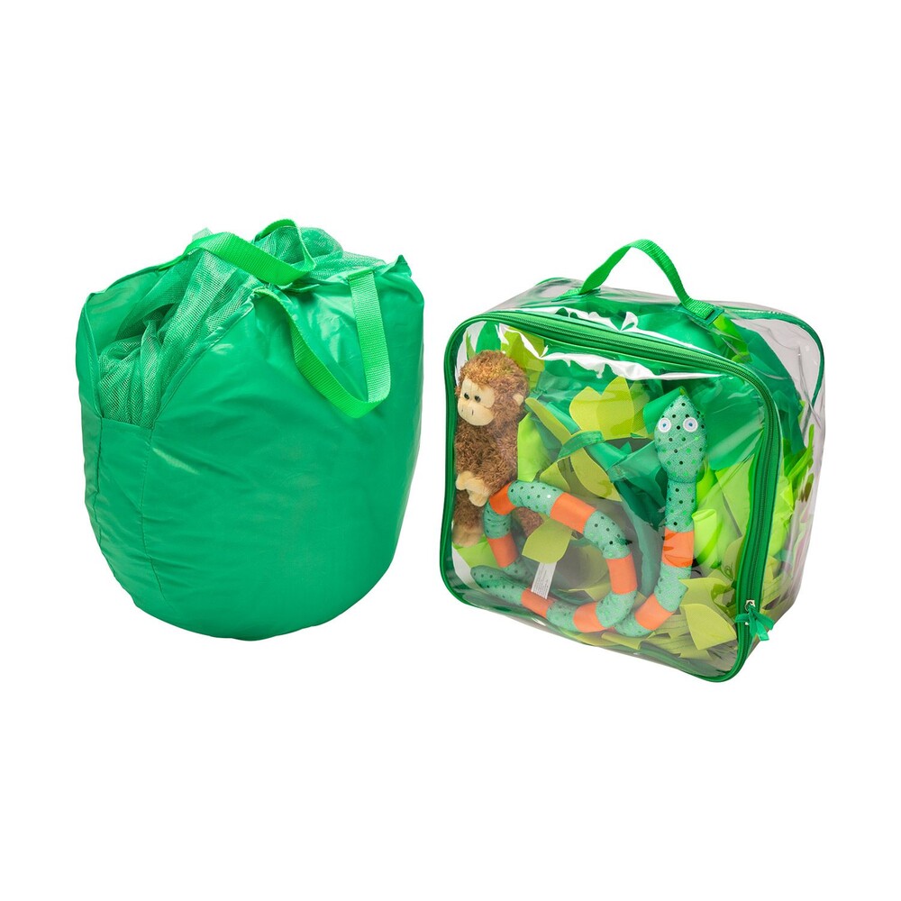Die Accessoires lassen sich einfach per Klettverschluss oder durch Anbinden befestigen, sodass die Kinder ihren Dschungel mitgestalten können. Wird der Baldachin nicht gebraucht, kann er kompakt in der mitgelieferten Tasche verstaut werden. Der Stoff ist per Handwäsche leicht zu reinigen.