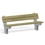 Eine moderne und universelle Bank auf Betonrahmen, mit Lehne mit zeitlosem Design. Ein bequemer Sitz sorgt für eine angenehme Ruhe. Bank ideal geeignet für urbane Räume, Parks, Plätze und Spielplätze, wo sie viele Jahre dienen wird, ohne etwas von ihrer Attraktivität und Funktionalität zu verlieren.