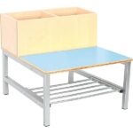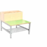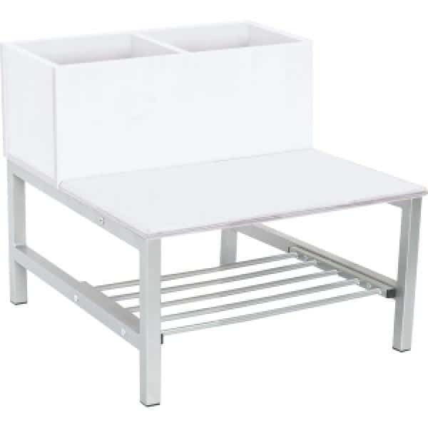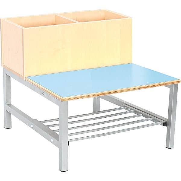 Sitzbank aus farbigem HPL-laminiertem Sperrholz (Stärke: 19 mm); Schuhablage mit Gitterrost; Rückenlehne mit 4 oder 2 Fächern (Innenmaße: 27 x 27 cm), zur Aufbewahrung von Utensilien. Passend zu den Regalen 092514, 092516 (für 4 Kinder) oder 092515, 092517, 092808 (für 2 Kinder).