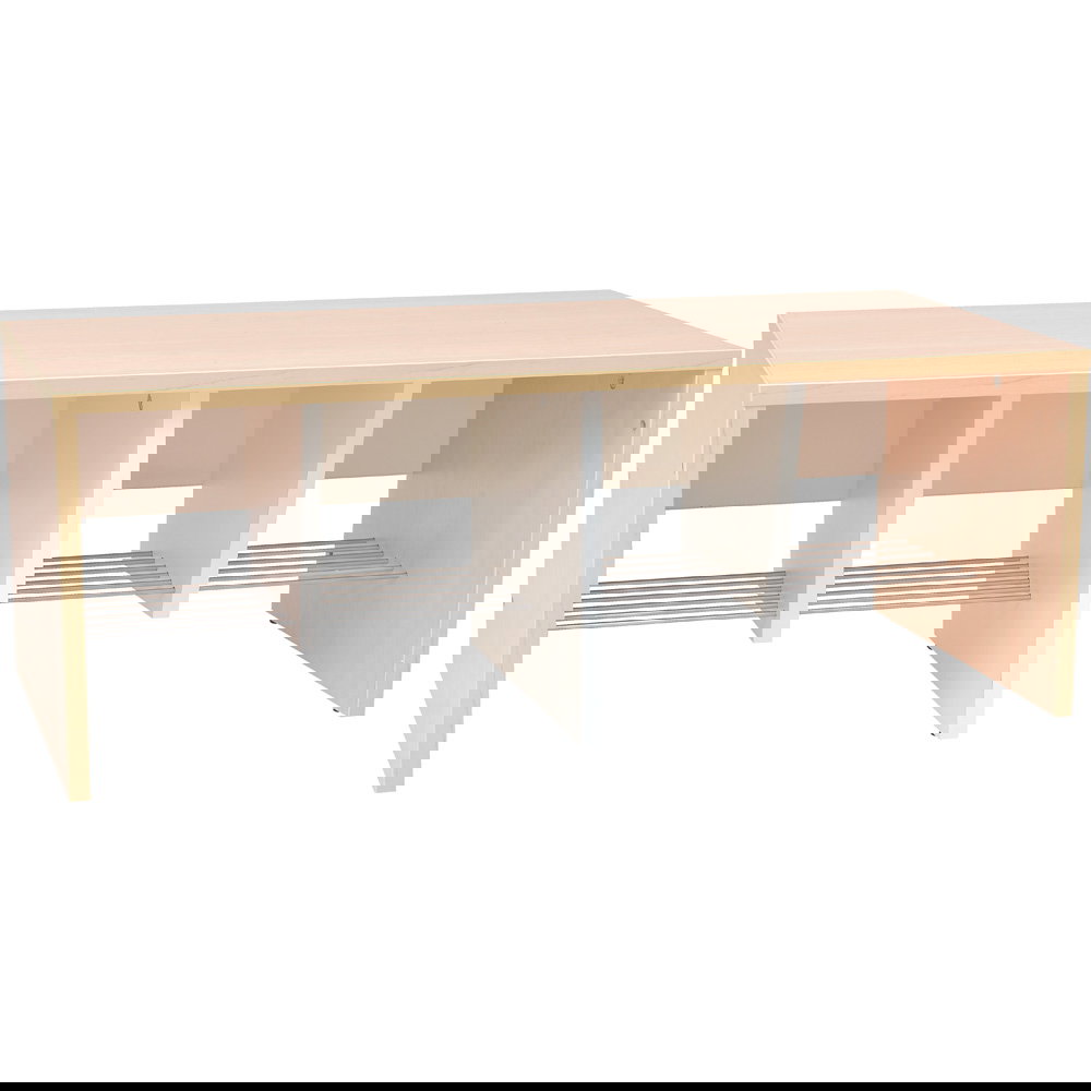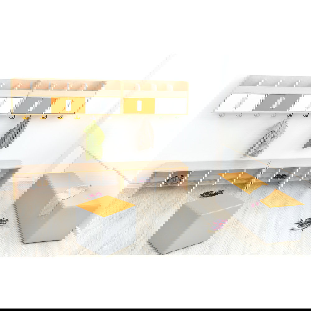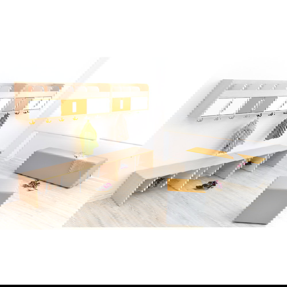 Erhältlich in zwei Breiten – für 4 oder 6 Kinder – und zwei Sitzhöhen (26 cm oder 34 cm), passt sich die Garderobenbank Quadro flexibel Ihren Bedürfnissen an. Die Abstände zur Schuhablage und zur Sitzfläche sind so konzipiert, dass Kinder leicht ihre Schuhe ablegen und wieder anziehen können. Hergestellt aus 18 mm starker, laminierter Spanplatte, kombiniert die Bank Langlebigkeit mit einem ansprechenden Design. Die Mittelwände und Einlegeböden sind immer weiß, während der Korpus entweder in Weiß oder in Ahorn-Dekor erhältlich ist.