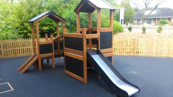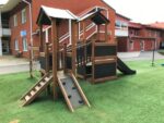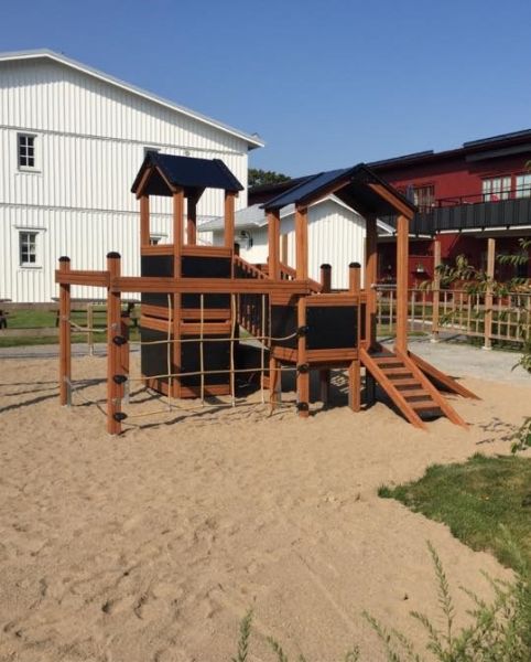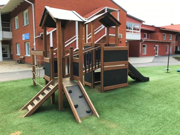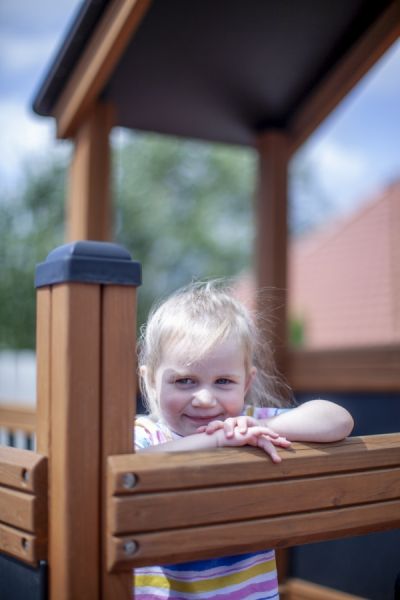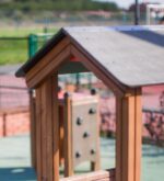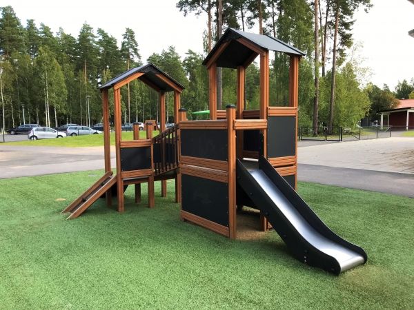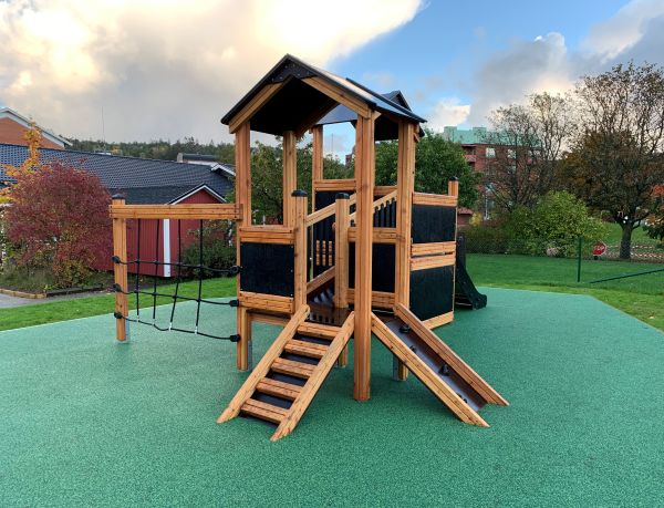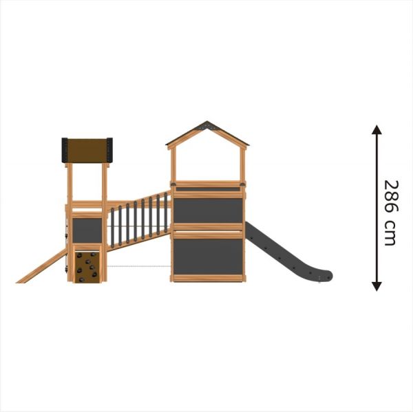 Gefertigt aus erstklassigen, natürlichen Materialien wie Lärchenholz und Edelstahl, kombiniert das Spielhaus Langlebigkeit mit moderner Eleganz. Die klassisch gehaltenen Braun- und Schwarztöne fügen sich harmonisch in jeden Garten oder öffentlichen Spielbereich ein. Das Spielgerät ist speziell darauf ausgerichtet, Kinder körperlich zu fördern, sozialen Austausch zu ermöglichen und einen sicheren, unterhaltsamen Raum zum Spielen zu bieten.