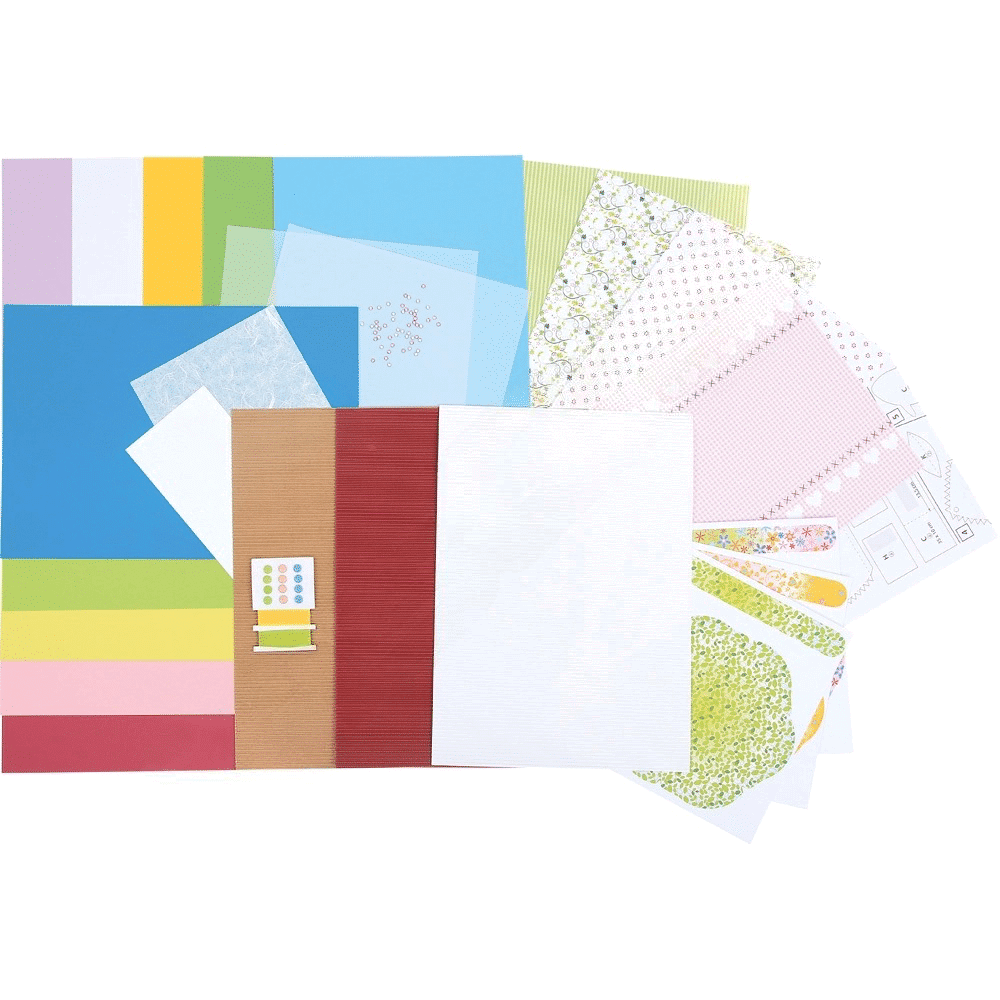 - 12 Klammern, 2 Bänder, 1 Bogen Faserseide (15,5 x 22,5 cm, weiß) und 1 Bogen Reliefsticker – für zusätzliche kreative Möglichkeiten.