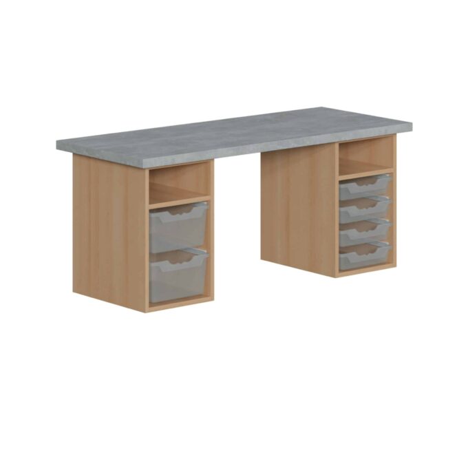 Der „kreative“ Bastelarbeitsplatz besticht mit seinem durchdachten Design und umfassender Funktionalität. Auf der rechten Seite sind vier flache ErgoTray Boxen für die übersichtliche Aufbewahrung von Bastelmaterialien positioniert, während auf der linken Seite zwei hohe ErgoTray Boxen zusätzlichen Stauraum für größere Utensilien bieten. Ein kleines Ablagefach über den Boxen dient der schnellen Ablage und dem einfachen Zugriff auf häufig genutzte Gegenstände. Die Oberfläche dieses Arbeitsplatzes zeichnet sich durch eine extrem strapazierfähige Arbeitsplatte im charmanten Dekor „Light Atelier“ aus – eine ideale Basis für sämtliche kreative Projekte.