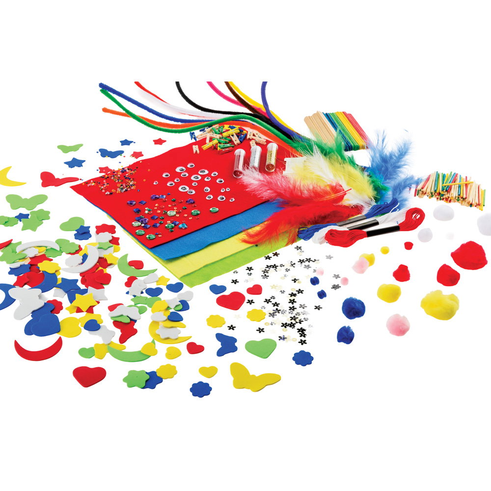 Mit 1300 Teilen sind der Fantasie keine Grenzen gesetzt. Basteln Sie lustige Tiere aus Chenilledraht und Wackelaugen, gestalten Sie individuelle Schmuckstücke mit Perlen und Nylongarn oder kreieren Sie farbenfrohe Collagen mit Filz und Moosgummi. Die Mischung aus Textilien, Holz, Kunststoff und Naturmaterialien (Federn) ermöglicht es, verschiedenste Techniken auszuprobieren. - Ideal für Gruppenarbeiten und Klassen