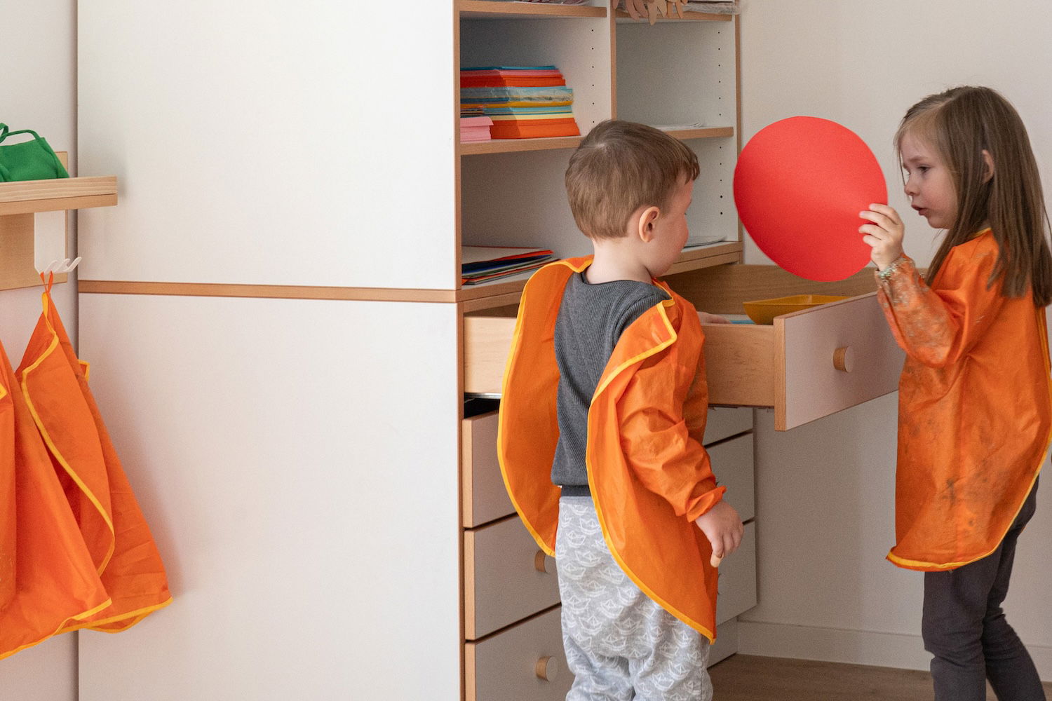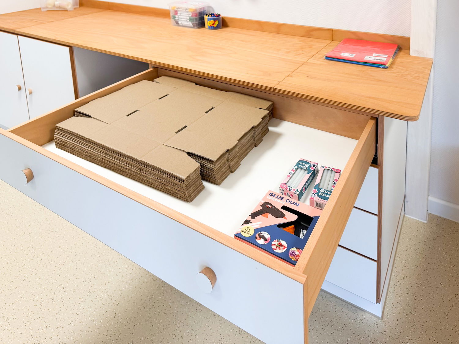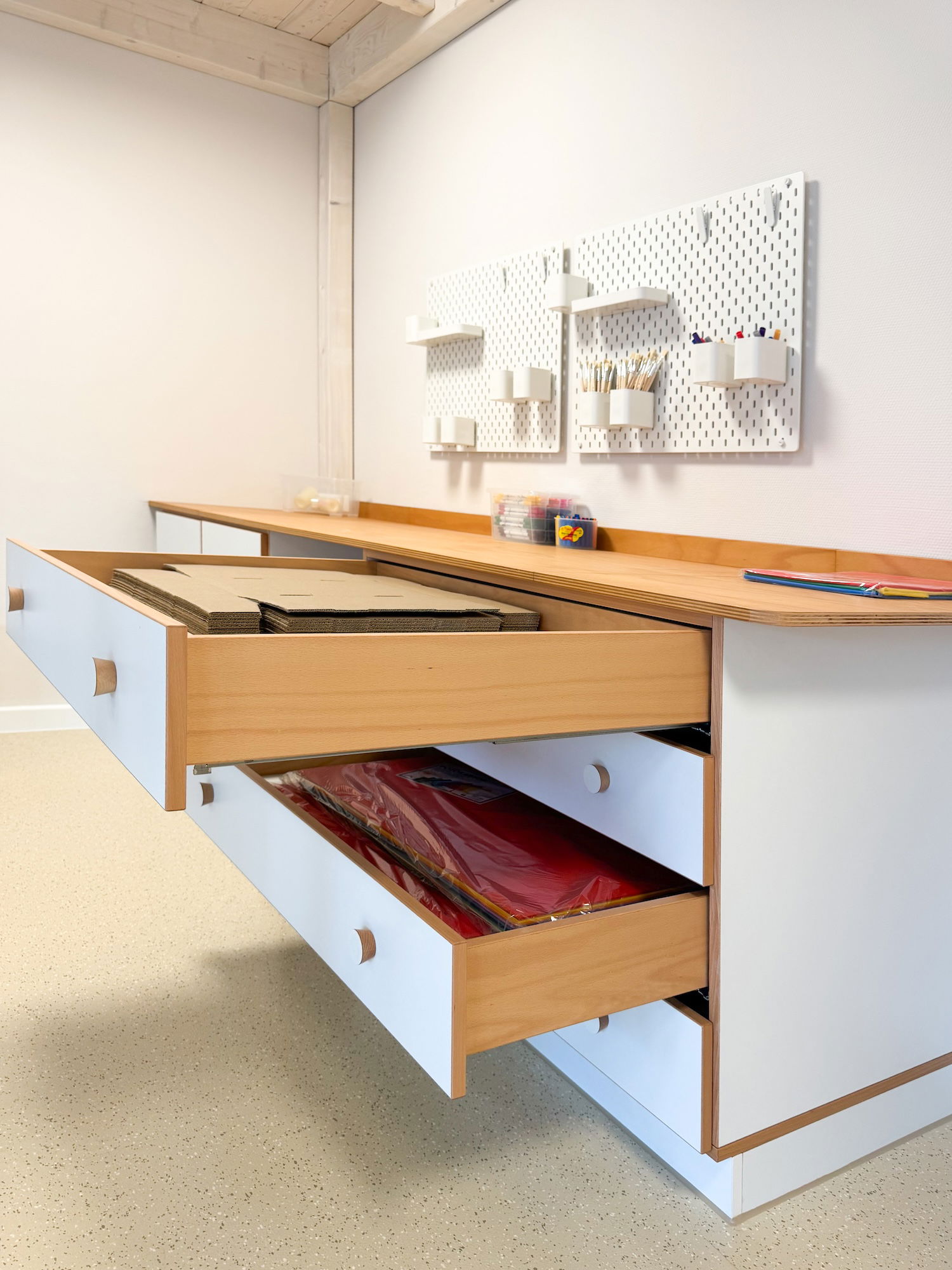 Diese Möbelkombination wurde entwickelt, um den Arbeitsalltag im Kreativbereich zu erleichtern und den Kindern optimale Bedingungen für ihr Schaffen zu bieten.