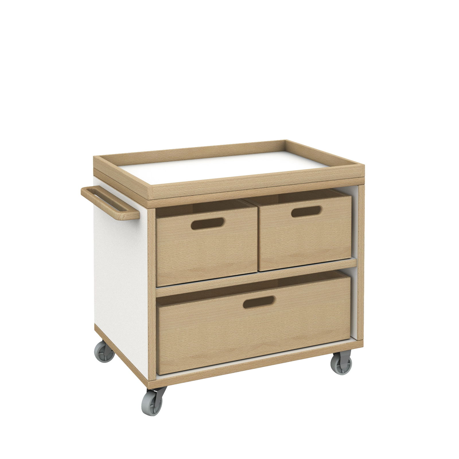 Kreative Prozesse sind dynamisch. Der kleine Materialwagen macht Schluss mit dem ständigen Hin- und Herlaufen zum Schrank. Bestückt mit drei robusten Stapelkisten bringt er Stifte, Pinsel und Farben direkt an den Basteltisch. Nach getaner Arbeit rollt er einfach wieder an seinen Platz zurück – so bleibt der Tisch frei und der Raum flexibel nutzbar. - Ordnung mit System