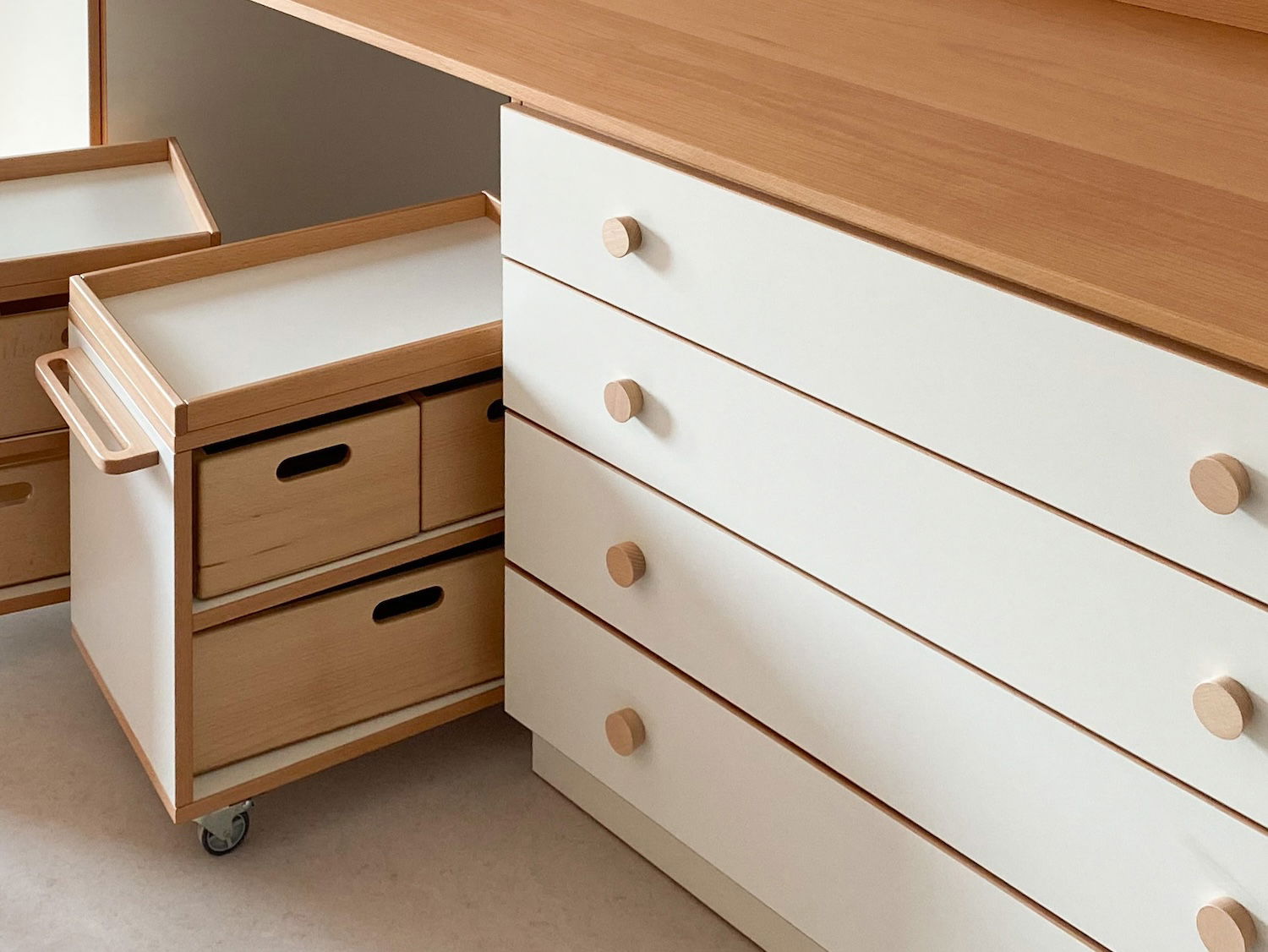 Papierlagerung ist oft eine Herausforderung. Der tiefe Schubladenschrank löst dieses Problem elegant: Seine geräumigen Auszüge fassen Formate bis DIN A1 liegend. Endlich gibt es keine Eselsohren mehr an großen Tonkartonbögen oder Plakaten. Zudem bieten die Schubladen reichlich Platz für Scheren, Kleber, Wolle und alles, was das Bastlerherz begehrt. - Mobilität am Arbeitsplatz