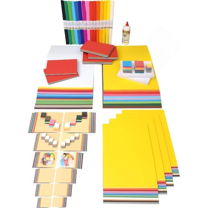 Zusätzlich finden Sie 50 Blätter Fotokarton in A4, 250 Blätter Zeichenpapier in Weiß sowie ein Krepppapier-Set mit 15 Rollen in diversen Farben – alles, was Ihre kleinen Bastler für kreative Projekte benötigen! Besonders spannend sind auch die 2100 Origami-Faltblätter in quadratischer Form sowie 500 Faltblätter in 40 mm und 80 mm – perfekt für Origami-Kunstwerke in vielen Farben!