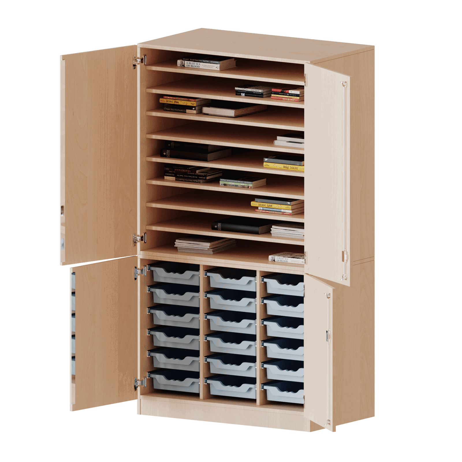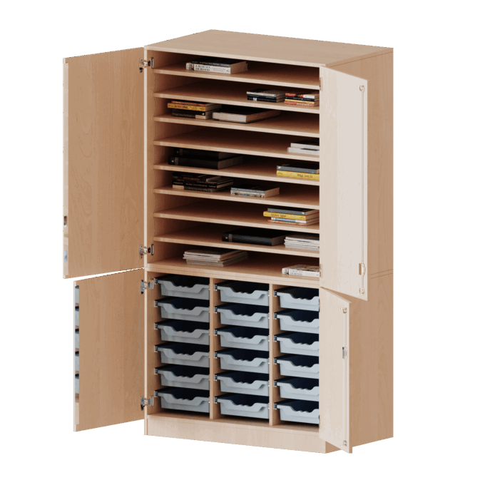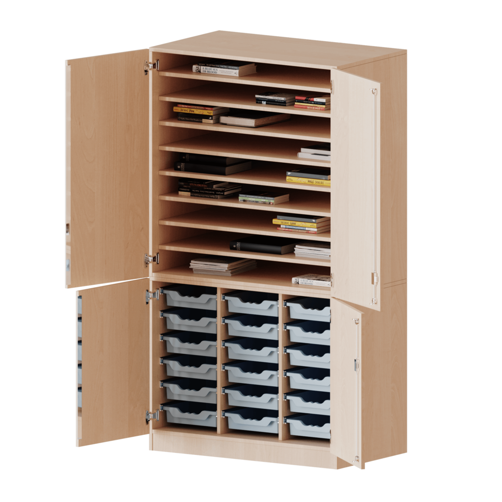 - Volle Kontrolle dank vier Türen: Die vier Halbtüren sind der Schlüssel zur Flexibilität. Sie ermöglichen einen unabhängigen Zugriff auf den oberen und unteren Bereich. So können Sie beispielsweise nur die Bastelboxen im unteren Teil freigeben, während der Papiervorrat oben sicher verschlossen bleibt. Das ist ideal für eine gezielte Materialausgabe.