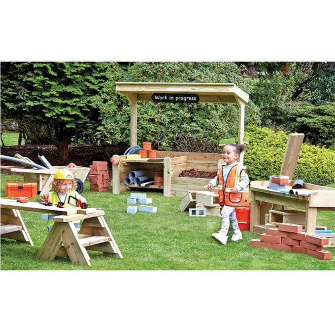 Eine Baustelle funktioniert nur im Team. Das Set bietet genug Material für eine ganze Gruppe von Kindern.- Kooperation: Ein Kind belädt die Schubkarre, ein anderes schiebt sie zur Baustelle, während ein drittes an der Werkbank Materialien vorbereitet.