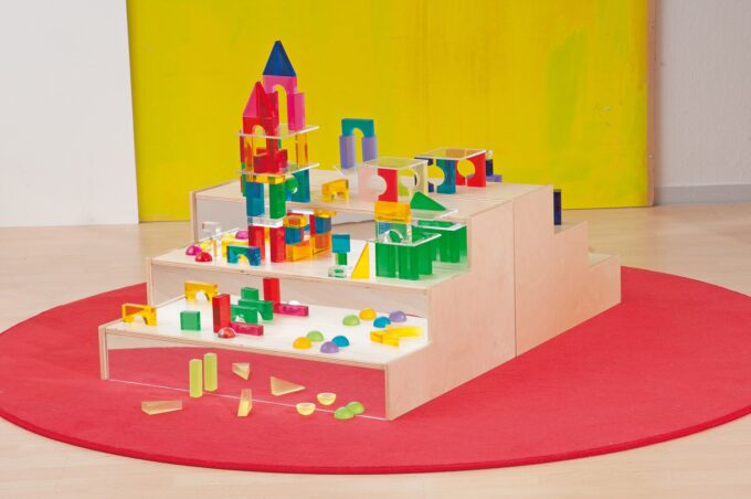 - Erweiterte Spielwelten: Die Bau- und Spielstufen bieten Kindern die Möglichkeit, ihre Spielumgebung zu verändern. Sie sind perfekt für den Einsatz mit Bausteinen, Kugelbahnen oder als Teil von Rollenspielen. Kinder erleben neue Dimensionen und entdecken die Welt auf unterschiedliche Weise.