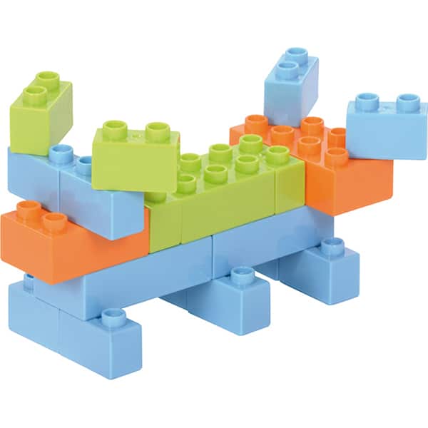 Mit klassischen großen Bausteinen kombinierbar … Roboter, Blume, Dino und viele weitere Figuren können schon kleinere Kinder mit diesen großen Bausteinen nachbauen – ein Beiblatt mit Motiven ist enthalten. Die Bausteine in 11 Farben haben 2, 4, 6, oder 8 Noppen (große Bauplatte nicht inkl.) und sind kompatibel mit unseren transparenten Bausteinen 120-574 und den bekannten Markenbausteinen.